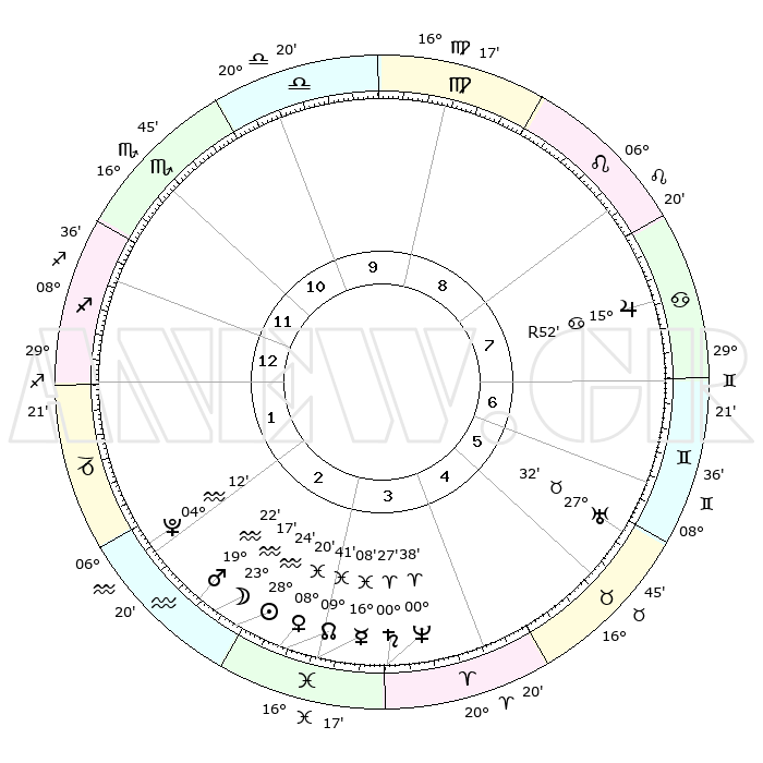| | ΘΕΣΕΙΣ ΠΛΑΝΗΤΩΝ ΑΣΤΡΟΛΟΓΙΚΟΥ ΧΑΡΤΗ ΤΗΣ ΣΤΙΓΜΗΣ ΑΥΤΗΣ | | | | Πλανήτης | Ζώδιο | Μοίρες | Δεκαήμ. | Σε οίκο | Απόκλιση | | Ακμές των οίκων | | Ηλιος | Υδροχόος | 28°20' | Τρίτο | 3 | 12 S 03 | | 1ος | 05°29' | Τοξότης | | Σελήνη | Υδροχόος | 22°17' | Τρίτο | 3 | 15 S 31 | | 2ος | 07°26' | Αιγόκερως | | Ερμής | Ιχθείς | 16°02' | Δεύτερο | 3 | 05 S 02 | | 3ος | 14°04' | Υδροχόος | | Αφροδίτη | Ιχθείς | 08°14' | Πρώτο | 3 | 09 S 50 | | 4ος | 20°09' | Ιχθείς | | Αρης | Υδροχόος | 19°18' | Δεύτερο | 3 | 16 S 03 | | 5ος | 20°27' | Κριός | | Δίας | Καρκίνος | 15°53'R | Δεύτερο | 8 | 22 N 49 | | 6ος | 14°46' | Ταύρος | | Κρόνος | Κριός | 00°27' | Πρώτο | 4 | 01 S 47 | | 7ος | 05°29' | Δίδυμοι | | Ουρανός | Ταύρος | 27°32' | Τρίτο | 6 | 19 N 26 | | 8ος | 07°26' | Καρκίνος | | Ποσειδώνας | Κριός | 00°38' | Πρώτο | 4 | 00 S 57 | | 9ος | 14°04' | Λέων | | Πλούτωνας | Υδροχόος | 04°12' | Πρώτο | 2 | 22 S 56 | | 10ος | 20°09' | Παρθένος | | Β. Δεσμός | Ιχθείς | 09°41' | Πρώτο | 3 | 07 S 56 | | 11ος | 20°27' | Ζυγός | | Ωροσκόπος | Τοξότης | 05°29' | Πρώτο | | | 12ος | 14°46' | Σκορπιός | | Μεσουράνημα | Παρθένος | 20°09' | Τρίτο | | | |