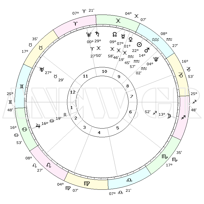 | | ΘΕΣΕΙΣ ΠΛΑΝΗΤΩΝ ΑΣΤΡΟΛΟΓΙΚΟΥ ΧΑΡΤΗ ΤΗΣ ΣΤΙΓΜΗΣ ΑΥΤΗΣ | | | | Πλανήτης | Ζώδιο | Μοίρες | Δεκαήμ. | Σε οίκο | Απόκλιση | | Ακμές των οίκων | | Ηλιος | Υδροχόος | 22°57' | Τρίτο | 6 | 13 S 52 | | 1ος | 26°51' | Λέων | | Σελήνη | Τοξότης | 16°17' | Δεύτερο | 4 | 27 S 55 | | 2ος | 20°23' | Παρθένος | | Ερμής | Ιχθείς | 08°06' | Πρώτο | 7 | 09 S 06 | | 3ος | 18°45' | Ζυγός | | Αφροδίτη | Ιχθείς | 01°34' | Πρώτο | 7 | 12 S 17 | | 4ος | 21°37' | Σκορπιός | | Αρης | Υδροχόος | 15°07' | Δεύτερο | 6 | 17 S 19 | | 5ος | 26°02' | Τοξότης | | Δίας | Καρκίνος | 16°18'R | Δεύτερο | 11 | 22 N 46 | | 6ος | 28°15' | Αιγόκερως | | Κρόνος | Ιχθείς | 29°52' | Τρίτο | 8 | 02 S 02 | | 7ος | 26°51' | Υδροχόος | | Ουρανός | Ταύρος | 27°29' | Τρίτο | 10 | 19 N 25 | | 8ος | 20°23' | Ιχθείς | | Ποσειδώνας | Κριός | 00°28' | Πρώτο | 8 | 01 S 01 | | 9ος | 18°45' | Κριός | | Πλούτωνας | Υδροχόος | 04°02' | Πρώτο | 6 | 22 S 58 | | 10ος | 21°37' | Ταύρος | | Β. Δεσμός | Ιχθείς | 09°58' | Πρώτο | 7 | 07 S 50 | | 11ος | 26°02' | Δίδυμοι | | Ωροσκόπος | Λέων | 26°51' | Τρίτο | | | 12ος | 28°15' | Καρκίνος | | Μεσουράνημα | Ταύρος | 21°37' | Τρίτο | | | |