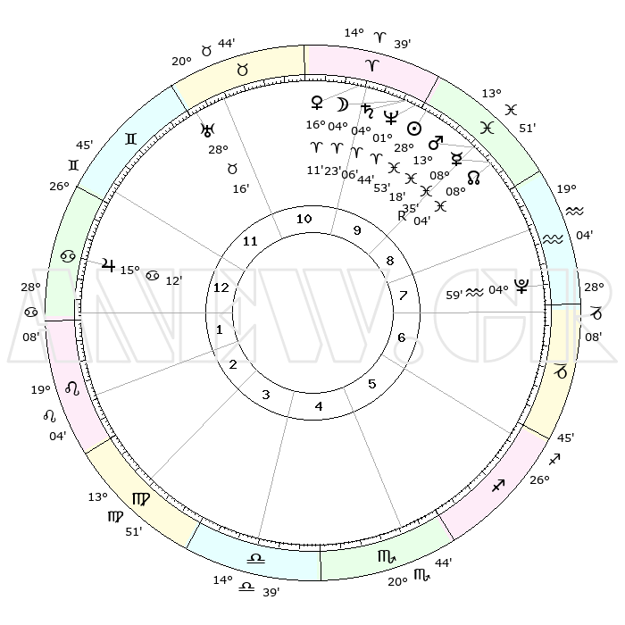 | | ΘΕΣΕΙΣ ΠΛΑΝΗΤΩΝ ΑΣΤΡΟΛΟΓΙΚΟΥ ΧΑΡΤΗ ΤΗΣ ΣΤΙΓΜΗΣ ΑΥΤΗΣ | | | | Πλανήτης | Ζώδιο | Μοίρες | Δεκαήμ. | Σε οίκο | Απόκλιση | | Ακμές των οίκων | | Ηλιος | Ιχθείς | 28°48' | Τρίτο | 10 | 00 S 29 | | 1ος | 05°59' | Καρκίνος | | Σελήνη | Κριός | 03°21' | Πρώτο | 10 | 03 N 20 | | 2ος | 26°31' | Καρκίνος | | Ερμής | Ιχθείς | 08°35'R | Πρώτο | 9 | 07 S 07 | | 3ος | 18°46' | Λέων | | Αφροδίτη | Κριός | 16°06' | Δεύτερο | 10 | 05 N 29 | | 4ος | 16°03' | Παρθένος | | Αρης | Ιχθείς | 13°15' | Δεύτερο | 9 | 07 S 35 | | 5ος | 20°52' | Ζυγός | | Δίας | Καρκίνος | 15°12' | Δεύτερο | 1 | 22 N 56 | | 6ος | 00°18' | Τοξότης | | Κρόνος | Κριός | 04°05' | Πρώτο | 10 | 00 S 20 | | 7ος | 05°59' | Αιγόκερως | | Ουρανός | Ταύρος | 28°16' | Τρίτο | 11 | 19 N 36 | | 8ος | 26°31' | Αιγόκερως | | Ποσειδώνας | Κριός | 01°44' | Πρώτο | 10 | 00 S 31 | | 9ος | 18°46' | Υδροχόος | | Πλούτωνας | Υδροχόος | 04°59' | Πρώτο | 8 | 22 S 49 | | 10ος | 16°03' | Ιχθείς | | Β. Δεσμός | Ιχθείς | 08°04' | Πρώτο | 9 | 08 S 32 | | 11ος | 20°52' | Κριός | | Ωροσκόπος | Καρκίνος | 05°59' | Πρώτο | | | 12ος | 00°18' | Δίδυμοι | | Μεσουράνημα | Ιχθείς | 16°03' | Δεύτερο | | | |