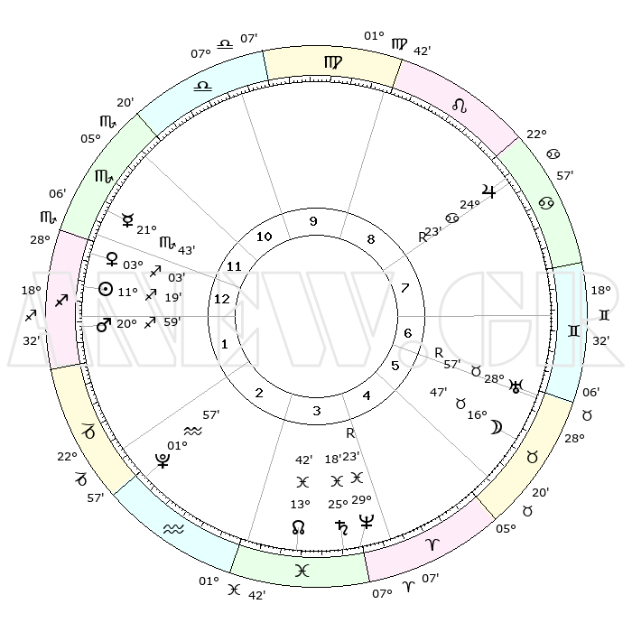 | | ΘΕΣΕΙΣ ΠΛΑΝΗΤΩΝ ΑΣΤΡΟΛΟΓΙΚΟΥ ΧΑΡΤΗ ΤΗΣ ΣΤΙΓΜΗΣ ΑΥΤΗΣ | | | | Πλανήτης | Ζώδιο | Μοίρες | Δεκαήμ. | Σε οίκο | Απόκλιση | | Ακμές των οίκων | | Ηλιος | Τοξότης | 11°57' | Δεύτερο | 4 | 22 S 13 | | 1ος | 29°38' | Λέων | | Σελήνη | Ταύρος | 26°20' | Τρίτο | 10 | 23 N 58 | | 2ος | 23°27' | Παρθένος | | Ερμής | Σκορπιός | 22°05' | Τρίτο | 3 | 15 S 47 | | 3ος | 22°05' | Ζυγός | | Αφροδίτη | Τοξότης | 03°50' | Πρώτο | 4 | 20 S 19 | | 4ος | 25°00' | Σκορπιός | | Αρης | Τοξότης | 21°27' | Τρίτο | 4 | 23 S 51 | | 5ος | 29°13' | Τοξότης | | Δίας | Καρκίνος | 24°20'R | Τρίτο | 11 | 21 N 24 | | 6ος | 01°12' | Υδροχόος | | Κρόνος | Ιχθείς | 25°19' | Τρίτο | 8 | 04 S 02 | | 7ος | 29°38' | Υδροχόος | | Ουρανός | Ταύρος | 28°56'R | Τρίτο | 10 | 19 N 43 | | 8ος | 23°27' | Ιχθείς | | Ποσειδώνας | Ιχθείς | 29°23'R | Τρίτο | 8 | 01 S 29 | | 9ος | 22°05' | Κριός | | Πλούτωνας | Υδροχόος | 01°58' | Πρώτο | 6 | 23 S 23 | | 10ος | 25°00' | Ταύρος | | Β. Δεσμός | Ιχθείς | 13°39' | Δεύτερο | 7 | 06 S 25 | | 11ος | 29°13' | Δίδυμοι | | Ωροσκόπος | Λέων | 29°38' | Τρίτο | | | 12ος | 01°12' | Λέων | | Μεσουράνημα | Ταύρος | 25°00' | Τρίτο | | | |