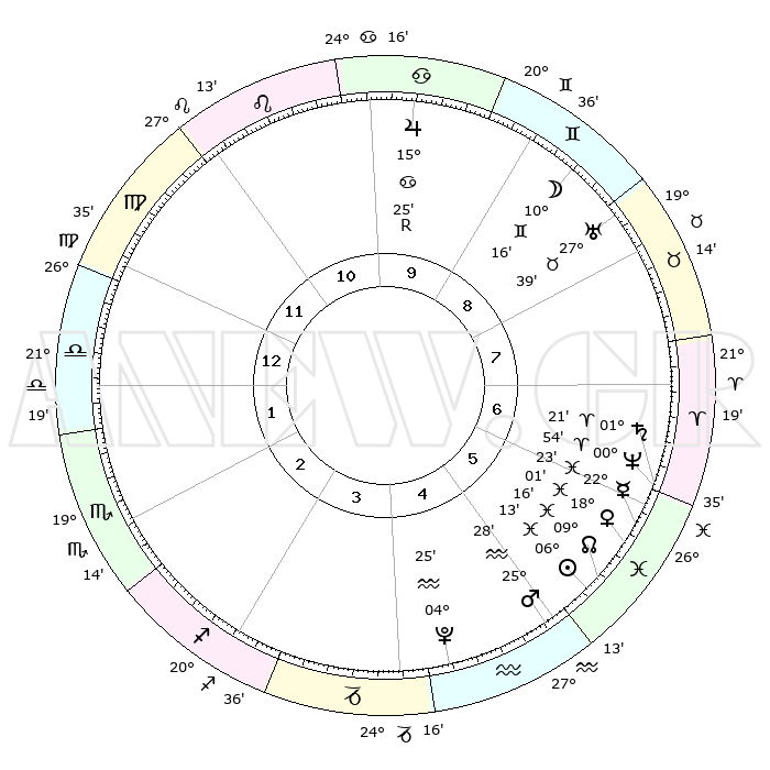 | | ΘΕΣΕΙΣ ΠΛΑΝΗΤΩΝ ΑΣΤΡΟΛΟΓΙΚΟΥ ΧΑΡΤΗ ΤΗΣ ΣΤΙΓΜΗΣ ΑΥΤΗΣ | | | | Πλανήτης | Ζώδιο | Μοίρες | Δεκαήμ. | Σε οίκο | Απόκλιση | | Ακμές των οίκων | | Ηλιος | Ιχθείς | 05°38' | Πρώτο | 12 | 09 S 27 | | 1ος | 24°26' | Ιχθείς | | Σελήνη | Δίδυμοι | 02°01' | Πρώτο | 2 | 25 N 42 | | 2ος | 06°01' | Ταύρος | | Ερμής | Ιχθείς | 22°14' | Τρίτο | 12 | 00 S 57 | | 3ος | 04°18' | Δίδυμοι | | Αφροδίτη | Ιχθείς | 17°18' | Δεύτερο | 12 | 06 S 20 | | 4ος | 26°52' | Δίδυμοι | | Αρης | Υδροχόος | 25°00' | Τρίτο | 12 | 14 S 13 | | 5ος | 18°57' | Καρκίνος | | Δίας | Καρκίνος | 15°27'R | Δεύτερο | 4 | 22 N 53 | | 6ος | 15°32' | Λέων | | Κρόνος | Κριός | 01°17' | Πρώτο | 1 | 01 S 27 | | 7ος | 24°26' | Παρθένος | | Ουρανός | Ταύρος | 27°38' | Τρίτο | 2 | 19 N 27 | | 8ος | 06°01' | Σκορπιός | | Ποσειδώνας | Κριός | 00°53' | Πρώτο | 1 | 00 S 51 | | 9ος | 04°18' | Τοξότης | | Πλούτωνας | Υδροχόος | 04°24' | Πρώτο | 11 | 22 S 54 | | 10ος | 26°52' | Τοξότης | | Β. Δεσμός | Ιχθείς | 09°18' | Πρώτο | 12 | 08 S 05 | | 11ος | 18°57' | Αιγόκερως | | Ωροσκόπος | Ιχθείς | 24°26' | Τρίτο | | | 12ος | 15°32' | Υδροχόος | | Μεσουράνημα | Τοξότης | 26°52' | Τρίτο | | | |