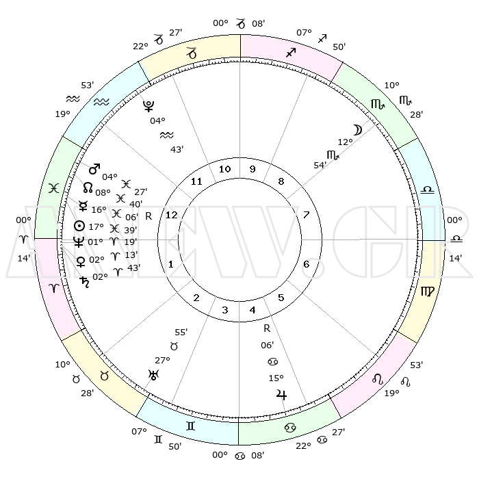 | | ΘΕΣΕΙΣ ΠΛΑΝΗΤΩΝ ΑΣΤΡΟΛΟΓΙΚΟΥ ΧΑΡΤΗ ΤΗΣ ΣΤΙΓΜΗΣ ΑΥΤΗΣ | | | | Πλανήτης | Ζώδιο | Μοίρες | Δεκαήμ. | Σε οίκο | Απόκλιση | | Ακμές των οίκων | | Ηλιος | Ιχθείς | 17°17' | Δεύτερο | 5 | 05 S 01 | | 1ος | 07°21' | Σκορπιός | | Σελήνη | Σκορπιός | 08°23' | Πρώτο | 1 | 18 S 36 | | 2ος | 06°14' | Τοξότης | | Ερμής | Ιχθείς | 16°29'R | Δεύτερο | 5 | 02 S 00 | | 3ος | 08°51' | Αιγόκερως | | Αφροδίτη | Κριός | 01°45' | Πρώτο | 5 | 00 S 26 | | 4ος | 13°34' | Υδροχόος | | Αρης | Ιχθείς | 04°09' | Πρώτο | 4 | 11 S 00 | | 5ος | 16°20' | Ιχθείς | | Δίας | Καρκίνος | 15°06'R | Δεύτερο | 9 | 22 N 56 | | 6ος | 14°16' | Κριός | | Κρόνος | Κριός | 02°40' | Πρώτο | 5 | 00 S 54 | | 7ος | 07°21' | Ταύρος | | Ουρανός | Ταύρος | 27°54' | Τρίτο | 7 | 19 N 31 | | 8ος | 06°14' | Δίδυμοι | | Ποσειδώνας | Κριός | 01°18' | Πρώτο | 5 | 00 S 41 | | 9ος | 08°51' | Καρκίνος | | Πλούτωνας | Υδροχόος | 04°43' | Πρώτο | 3 | 22 S 51 | | 10ος | 13°34' | Λέων | | Β. Δεσμός | Ιχθείς | 08°41' | Πρώτο | 4 | 08 S 19 | | 11ος | 16°20' | Παρθένος | | Ωροσκόπος | Σκορπιός | 07°21' | Πρώτο | | | 12ος | 14°16' | Ζυγός | | Μεσουράνημα | Λέων | 13°34' | Δεύτερο | | | |