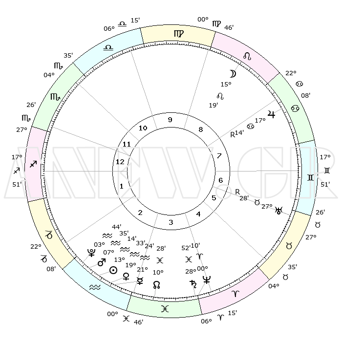 | | ΘΕΣΕΙΣ ΠΛΑΝΗΤΩΝ ΑΣΤΡΟΛΟΓΙΚΟΥ ΧΑΡΤΗ ΤΗΣ ΣΤΙΓΜΗΣ ΑΥΤΗΣ | | | | Πλανήτης | Ζώδιο | Μοίρες | Δεκαήμ. | Σε οίκο | Απόκλιση | | Ακμές των οίκων | | Ηλιος | Υδροχόος | 13°09' | Δεύτερο | 3 | 16 S 52 | | 1ος | 24°43' | Σκορπιός | | Σελήνη | Λέων | 14°13' | Δεύτερο | 9 | 18 N 40 | | 2ος | 25°10' | Τοξότης | | Ερμής | Υδροχόος | 21°16' | Τρίτο | 3 | 16 S 08 | | 3ος | 00°01' | Υδροχόος | | Αφροδίτη | Υδροχόος | 19°27' | Δεύτερο | 3 | 16 S 17 | | 4ος | 05°53' | Ιχθείς | | Αρης | Υδροχόος | 07°31' | Πρώτο | 3 | 19 S 24 | | 5ος | 07°31' | Κριός | | Δίας | Καρκίνος | 17°15'R | Δεύτερο | 8 | 22 N 38 | | 6ος | 03°17' | Ταύρος | | Κρόνος | Ιχθείς | 28°51' | Τρίτο | 4 | 02 S 27 | | 7ος | 24°43' | Ταύρος | | Ουρανός | Ταύρος | 27°28'R | Τρίτο | 7 | 19 N 24 | | 8ος | 25°10' | Δίδυμοι | | Ποσειδώνας | Κριός | 00°10' | Πρώτο | 4 | 01 S 08 | | 9ος | 00°01' | Λέων | | Πλούτωνας | Υδροχόος | 03°44' | Πρώτο | 3 | 23 S 01 | | 10ος | 05°53' | Παρθένος | | Β. Δεσμός | Ιχθείς | 10°28' | Δεύτερο | 4 | 07 S 38 | | 11ος | 07°31' | Ζυγός | | Ωροσκόπος | Σκορπιός | 24°43' | Τρίτο | | | 12ος | 03°17' | Σκορπιός | | Μεσουράνημα | Παρθένος | 05°53' | Πρώτο | | | |