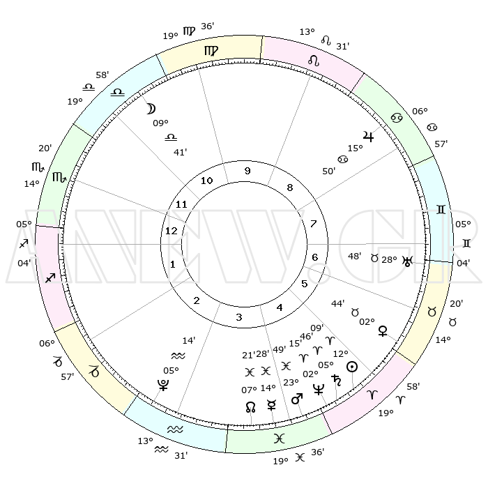| | ΘΕΣΕΙΣ ΠΛΑΝΗΤΩΝ ΑΣΤΡΟΛΟΓΙΚΟΥ ΧΑΡΤΗ ΤΗΣ ΣΤΙΓΜΗΣ ΑΥΤΗΣ | | | | Πλανήτης | Ζώδιο | Μοίρες | Δεκαήμ. | Σε οίκο | Απόκλιση | | Ακμές των οίκων | | Ηλιος | Κριός | 12°05' | Δεύτερο | 5 | 04 N 47 | | 1ος | 17°15' | Σκορπιός | | Σελήνη | Ζυγός | 08°54' | Πρώτο | 11 | 05 S 56 | | 2ος | 16°56' | Τοξότης | | Ερμής | Ιχθείς | 14°25' | Δεύτερο | 4 | 07 S 27 | | 3ος | 20°43' | Αιγόκερως | | Αφροδίτη | Ταύρος | 02°39' | Πρώτο | 6 | 12 N 00 | | 4ος | 26°09' | Υδροχόος | | Αρης | Ιχθείς | 23°46' | Τρίτο | 4 | 03 S 26 | | 5ος | 28°25' | Ιχθείς | | Δίας | Καρκίνος | 15°50' | Δεύτερο | 8 | 22 N 52 | | 6ος | 25°10' | Κριός | | Κρόνος | Κριός | 05°46' | Πρώτο | 5 | 00 N 20 | | 7ος | 17°15' | Ταύρος | | Ουρανός | Ταύρος | 28°48' | Τρίτο | 7 | 19 N 43 | | 8ος | 16°56' | Δίδυμοι | | Ποσειδώνας | Κριός | 02°14' | Πρώτο | 5 | 00 S 19 | | 9ος | 20°43' | Καρκίνος | | Πλούτωνας | Υδροχόος | 05°14' | Πρώτο | 3 | 22 S 47 | | 10ος | 26°09' | Λέων | | Β. Δεσμός | Ιχθείς | 07°22' | Πρώτο | 4 | 08 S 48 | | 11ος | 28°25' | Παρθένος | | Ωροσκόπος | Σκορπιός | 17°15' | Δεύτερο | | | 12ος | 25°10' | Ζυγός | | Μεσουράνημα | Λέων | 26°09' | Τρίτο | | | |
