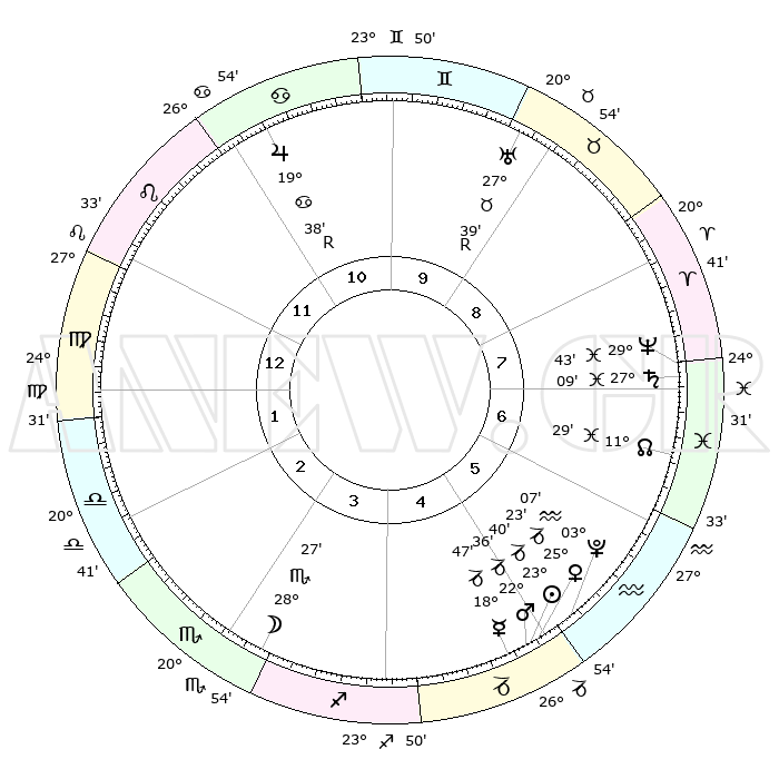| | ΘΕΣΕΙΣ ΠΛΑΝΗΤΩΝ ΑΣΤΡΟΛΟΓΙΚΟΥ ΧΑΡΤΗ ΤΗΣ ΣΤΙΓΜΗΣ ΑΥΤΗΣ | | | | Πλανήτης | Ζώδιο | Μοίρες | Δεκαήμ. | Σε οίκο | Απόκλιση | | Ακμές των οίκων | | Ηλιος | Αιγόκερως | 23°35' | Τρίτο | 5 | 21 S 22 | | 1ος | 02°43' | Παρθένος | | Σελήνη | Σκορπιός | 27°34' | Τρίτο | 3 | 24 S 29 | | 2ος | 26°51' | Παρθένος | | Ερμής | Αιγόκερως | 18°40' | Δεύτερο | 5 | 23 S 50 | | 3ος | 25°45' | Ζυγός | | Αφροδίτη | Αιγόκερως | 25°17' | Τρίτο | 5 | 22 S 00 | | 4ος | 28°42' | Σκορπιός | | Αρης | Αιγόκερως | 22°32' | Τρίτο | 5 | 22 S 30 | | 5ος | 02°42' | Αιγόκερως | | Δίας | Καρκίνος | 19°39'R | Δεύτερο | 11 | 22 N 16 | | 6ος | 04°28' | Υδροχόος | | Κρόνος | Ιχθείς | 27°09' | Τρίτο | 8 | 03 S 10 | | 7ος | 02°43' | Ιχθείς | | Ουρανός | Ταύρος | 27°39'R | Τρίτο | 9 | 19 N 27 | | 8ος | 26°51' | Ιχθείς | | Ποσειδώνας | Ιχθείς | 29°43' | Τρίτο | 8 | 01 S 20 | | 9ος | 25°45' | Κριός | | Πλούτωνας | Υδροχόος | 03°07' | Πρώτο | 5 | 23 S 08 | | 10ος | 28°42' | Ταύρος | | Β. Δεσμός | Ιχθείς | 11°30' | Δεύτερο | 7 | 07 S 15 | | 11ος | 02°42' | Καρκίνος | | Ωροσκόπος | Παρθένος | 02°43' | Πρώτο | | | 12ος | 04°28' | Λέων | | Μεσουράνημα | Ταύρος | 28°42' | Τρίτο | | | |