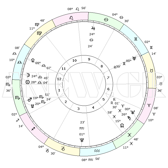 | ΘΕΣΕΙΣ ΠΛΑΝΗΤΩΝ ΑΣΤΡΟΛΟΓΙΚΟΥ ΧΑΡΤΗ ΤΗΣ ΣΤΙΓΜΗΣ ΑΥΤΗΣ | | Πλανήτης | Ζώδιο | Μοίρες | Δεκαήμ. | Σε οίκο | Απόκλιση | | Ακμές των οίκων | Ηλιος | Ζυγός | 27°48' | Τρίτο | 3 | 10 S 41 | | 1ος | 15°08' | Λέων | Σελήνη | Ζυγός | 21°33' | Τρίτο | 3 | 11 S 03 | | 2ος | 07°27' | Παρθένος | Ερμής | Σκορπιός | 20°03' | Τρίτο | 4 | 19 S 59 | | 3ος | 04°31' | Ζυγός | Αφροδίτη | Ζυγός | 08°47' | Πρώτο | 3 | 02 S 04 | | 4ος | 06°57' | Σκορπιός | Αρης | Σκορπιός | 19°40' | Δεύτερο | 4 | 17 S 55 | | 5ος | 12°12' | Τοξότης | Δίας | Καρκίνος | 24°23' | Τρίτο | 12 | 21 N 18 | | 6ος | 15°40' | Αιγόκερως | Κρόνος | Ιχθείς | 26°31'R | Τρίτο | 8 | 03 S 40 | | 7ος | 15°08' | Υδροχόος | Ουρανός | Δίδυμοι | 00°40'R | Πρώτο | 10 | 20 N 05 | | 8ος | 07°27' | Ιχθείς | Ποσειδώνας | Κριός | 00°02'R | Πρώτο | 8 | 01 S 15 | | 9ος | 04°31' | Κριός | Πλούτωνας | Υδροχόος | 01°23' | Πρώτο | 6 | 23 S 32 | | 10ος | 06°57' | Ταύρος | Β. Δεσμός | Ιχθείς | 15°59' | Δεύτερο | 8 | 05 S 32 | | 11ος | 12°12' | Δίδυμοι | Ωροσκόπος | Λέων | 15°08' | Δεύτερο | | | 12ος | 15°40' | Καρκίνος | Μεσουράνημα | Ταύρος | 06°57' | Πρώτο | | | |