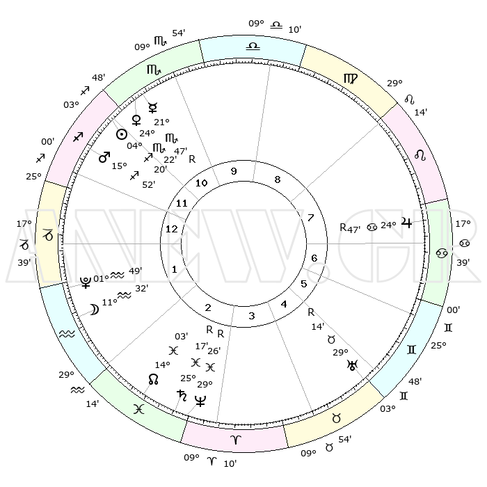 | | ΘΕΣΕΙΣ ΠΛΑΝΗΤΩΝ ΑΣΤΡΟΛΟΓΙΚΟΥ ΧΑΡΤΗ ΤΗΣ ΣΤΙΓΜΗΣ ΑΥΤΗΣ | | | | Πλανήτης | Ζώδιο | Μοίρες | Δεκαήμ. | Σε οίκο | Απόκλιση | | Ακμές των οίκων | | Ηλιος | Τοξότης | 04°20' | Πρώτο | 11 | 21 S 00 | | 1ος | 15°48' | Αιγόκερως | | Σελήνη | Υδροχόος | 11°28' | Δεύτερο | 1 | 19 S 58 | | 2ος | 26°58' | Υδροχόος | | Ερμής | Σκορπιός | 21°47'R | Τρίτο | 10 | 16 S 08 | | 3ος | 07°02' | Κριός | | Αφροδίτη | Σκορπιός | 24°22' | Τρίτο | 10 | 18 S 01 | | 4ος | 08°06' | Ταύρος | | Αρης | Τοξότης | 15°52' | Δεύτερο | 11 | 23 S 18 | | 5ος | 02°13' | Δίδυμοι | | Δίας | Καρκίνος | 24°48'R | Τρίτο | 7 | 21 N 18 | | 6ος | 23°26' | Δίδυμοι | | Κρόνος | Ιχθείς | 25°17'R | Τρίτο | 2 | 04 S 04 | | 7ος | 15°48' | Καρκίνος | | Ουρανός | Ταύρος | 29°14'R | Τρίτο | 4 | 19 N 47 | | 8ος | 26°58' | Λέων | | Ποσειδώνας | Ιχθείς | 29°26'R | Τρίτο | 2 | 01 S 28 | | 9ος | 07°02' | Ζυγός | | Πλούτωνας | Υδροχόος | 01°49' | Πρώτο | 1 | 23 S 25 | | 10ος | 08°06' | Σκορπιός | | Β. Δεσμός | Ιχθείς | 14°03' | Δεύτερο | 2 | 06 S 16 | | 11ος | 02°13' | Τοξότης | | Ωροσκόπος | Αιγόκερως | 15°48' | Δεύτερο | | | 12ος | 23°26' | Τοξότης | | Μεσουράνημα | Σκορπιός | 08°06' | Πρώτο | | | |