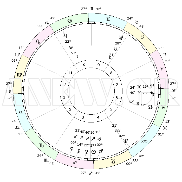 | | ΘΕΣΕΙΣ ΠΛΑΝΗΤΩΝ ΑΣΤΡΟΛΟΓΙΚΟΥ ΧΑΡΤΗ ΤΗΣ ΣΤΙΓΜΗΣ ΑΥΤΗΣ | | | | Πλανήτης | Ζώδιο | Μοίρες | Δεκαήμ. | Σε οίκο | Απόκλιση | | Ακμές των οίκων | | Ηλιος | Τοξότης | 26°50' | Τρίτο | 8 | 23 S 24 | | 1ος | 11°22' | Ταύρος | | Σελήνη | Τοξότης | 09°46' | Πρώτο | 7 | 26 S 51 | | 2ος | 10°32' | Δίδυμοι | | Ερμής | Τοξότης | 08°45' | Πρώτο | 7 | 20 S 41 | | 3ος | 03°03' | Καρκίνος | | Αφροδίτη | Τοξότης | 22°15' | Τρίτο | 8 | 23 S 11 | | 4ος | 24°54' | Καρκίνος | | Αρης | Αιγόκερως | 02°26' | Πρώτο | 8 | 24 S 13 | | 5ος | 20°34' | Λέων | | Δίας | Καρκίνος | 22°60'R | Τρίτο | 3 | 21 N 41 | | 6ος | 25°34' | Παρθένος | | Κρόνος | Ιχθείς | 25°39' | Τρίτο | 12 | 03 S 51 | | 7ος | 11°22' | Σκορπιός | | Ουρανός | Ταύρος | 28°22'R | Τρίτο | 1 | 19 N 36 | | 8ος | 10°32' | Τοξότης | | Ποσειδώνας | Ιχθείς | 29°24' | Τρίτο | 12 | 01 S 28 | | 9ος | 03°03' | Αιγόκερως | | Πλούτωνας | Υδροχόος | 02°20' | Πρώτο | 10 | 23 S 18 | | 10ος | 24°54' | Αιγόκερως | | Β. Δεσμός | Ιχθείς | 12°53' | Δεύτερο | 11 | 06 S 43 | | 11ος | 20°34' | Υδροχόος | | Ωροσκόπος | Ταύρος | 11°22' | Δεύτερο | | | 12ος | 25°34' | Ιχθείς | | Μεσουράνημα | Αιγόκερως | 24°54' | Τρίτο | | | |