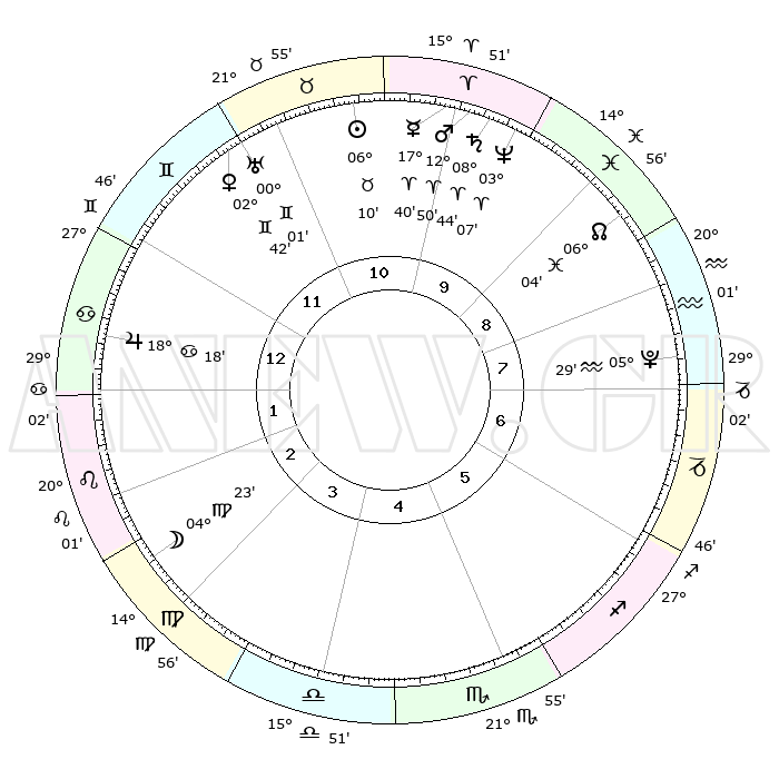 | | ΘΕΣΕΙΣ ΠΛΑΝΗΤΩΝ ΑΣΤΡΟΛΟΓΙΚΟΥ ΧΑΡΤΗ ΤΗΣ ΣΤΙΓΜΗΣ ΑΥΤΗΣ | | | | Πλανήτης | Ζώδιο | Μοίρες | Δεκαήμ. | Σε οίκο | Απόκλιση | | Ακμές των οίκων | | Ηλιος | Ταύρος | 06°06' | Πρώτο | 11 | 13 N 33 | | 1ος | 10°53' | Καρκίνος | | Σελήνη | Παρθένος | 03°35' | Πρώτο | 3 | 10 N 30 | | 2ος | 01°19' | Λέων | | Ερμής | Κριός | 17°34' | Δεύτερο | 10 | 04 N 43 | | 3ος | 24°02' | Λέων | | Αφροδίτη | Δίδυμοι | 02°37' | Πρώτο | 11 | 21 N 21 | | 4ος | 22°09' | Παρθένος | | Αρης | Κριός | 12°47' | Δεύτερο | 10 | 04 N 12 | | 5ος | 27°31' | Ζυγός | | Δίας | Καρκίνος | 18°17' | Δεύτερο | 1 | 22 N 34 | | 6ος | 06°20' | Τοξότης | | Κρόνος | Κριός | 08°44' | Πρώτο | 10 | 01 N 28 | | 7ος | 10°53' | Αιγόκερως | | Ουρανός | Δίδυμοι | 00°01' | Πρώτο | 11 | 19 N 59 | | 8ος | 01°19' | Υδροχόος | | Ποσειδώνας | Κριός | 03°07' | Πρώτο | 10 | 00 N 02 | | 9ος | 24°02' | Υδροχόος | | Πλούτωνας | Υδροχόος | 05°29' | Πρώτο | 8 | 22 S 48 | | 10ος | 22°09' | Ιχθείς | | Β. Δεσμός | Ιχθείς | 06°04' | Πρώτο | 9 | 09 S 17 | | 11ος | 27°31' | Κριός | | Ωροσκόπος | Καρκίνος | 10°53' | Δεύτερο | | | 12ος | 06°20' | Δίδυμοι | | Μεσουράνημα | Ιχθείς | 22°09' | Τρίτο | | | |