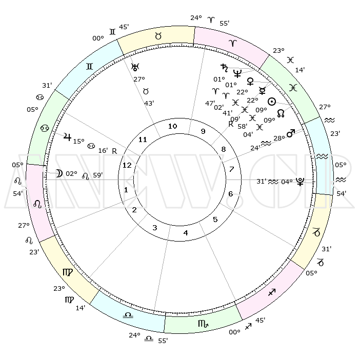 | | ΘΕΣΕΙΣ ΠΛΑΝΗΤΩΝ ΑΣΤΡΟΛΟΓΙΚΟΥ ΧΑΡΤΗ ΤΗΣ ΣΤΙΓΜΗΣ ΑΥΤΗΣ | | | | Πλανήτης | Ζώδιο | Μοίρες | Δεκαήμ. | Σε οίκο | Απόκλιση | | Ακμές των οίκων | | Ηλιος | Ιχθείς | 09°54' | Πρώτο | 9 | 07 S 51 | | 1ος | 18°18' | Καρκίνος | | Σελήνη | Λέων | 02°09' | Πρώτο | 1 | 22 N 46 | | 2ος | 08°47' | Λέων | | Ερμής | Ιχθείς | 22°10'R | Τρίτο | 9 | 00 S 09 | | 3ος | 02°19' | Παρθένος | | Αφροδίτη | Ιχθείς | 22°36' | Τρίτο | 9 | 04 S 11 | | 4ος | 01°40' | Ζυγός | | Αρης | Υδροχόος | 28°22' | Τρίτο | 8 | 13 S 04 | | 5ος | 07°35' | Σκορπιός | | Δίας | Καρκίνος | 15°16'R | Δεύτερο | 12 | 22 N 54 | | 6ος | 15°16' | Τοξότης | | Κρόνος | Κριός | 01°47' | Πρώτο | 10 | 01 S 15 | | 7ος | 18°18' | Αιγόκερως | | Ουρανός | Ταύρος | 27°43' | Τρίτο | 11 | 19 N 28 | | 8ος | 08°47' | Υδροχόος | | Ποσειδώνας | Κριός | 01°02' | Πρώτο | 9 | 00 S 47 | | 9ος | 02°19' | Ιχθείς | | Πλούτωνας | Υδροχόος | 04°31' | Πρώτο | 7 | 22 S 53 | | 10ος | 01°40' | Κριός | | Β. Δεσμός | Ιχθείς | 09°04' | Πρώτο | 9 | 08 S 10 | | 11ος | 07°35' | Ταύρος | | Ωροσκόπος | Καρκίνος | 18°18' | Δεύτερο | | | 12ος | 15°16' | Δίδυμοι | | Μεσουράνημα | Κριός | 01°40' | Πρώτο | | | |