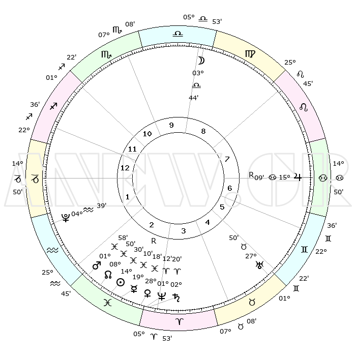| | ΘΕΣΕΙΣ ΠΛΑΝΗΤΩΝ ΑΣΤΡΟΛΟΓΙΚΟΥ ΧΑΡΤΗ ΤΗΣ ΣΤΙΓΜΗΣ ΑΥΤΗΣ | | | | Πλανήτης | Ζώδιο | Μοίρες | Δεκαήμ. | Σε οίκο | Απόκλιση | | Ακμές των οίκων | | Ηλιος | Ιχθείς | 14°26' | Δεύτερο | 3 | 06 S 08 | | 1ος | 20°38' | Τοξότης | | Σελήνη | Ζυγός | 02°49' | Πρώτο | 9 | 03 S 05 | | 2ος | 25°32' | Αιγόκερως | | Ερμής | Ιχθείς | 19°14'R | Δεύτερο | 3 | 00 S 53 | | 3ος | 04°33' | Ιχθείς | | Αφροδίτη | Ιχθείς | 28°13' | Τρίτο | 3 | 01 S 54 | | 4ος | 09°46' | Κριός | | Αρης | Ιχθείς | 01°55' | Πρώτο | 2 | 11 S 49 | | 5ος | 07°38' | Ταύρος | | Δίας | Καρκίνος | 15°09'R | Δεύτερο | 7 | 22 N 55 | | 6ος | 00°11' | Δίδυμοι | | Κρόνος | Κριός | 02°19' | Πρώτο | 3 | 01 S 02 | | 7ος | 20°38' | Δίδυμοι | | Ουρανός | Ταύρος | 27°50' | Τρίτο | 5 | 19 N 30 | | 8ος | 25°32' | Καρκίνος | | Ποσειδώνας | Κριός | 01°12' | Πρώτο | 3 | 00 S 43 | | 9ος | 04°33' | Παρθένος | | Πλούτωνας | Υδροχόος | 04°39' | Πρώτο | 2 | 22 S 51 | | 10ος | 09°46' | Ζυγός | | Β. Δεσμός | Ιχθείς | 08°50' | Πρώτο | 3 | 08 S 15 | | 11ος | 07°38' | Σκορπιός | | Ωροσκόπος | Τοξότης | 20°38' | Τρίτο | | | 12ος | 00°11' | Τοξότης | | Μεσουράνημα | Ζυγός | 09°46' | Πρώτο | | | |