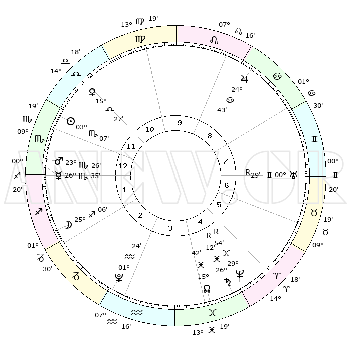 | | ΘΕΣΕΙΣ ΠΛΑΝΗΤΩΝ ΑΣΤΡΟΛΟΓΙΚΟΥ ΧΑΡΤΗ ΤΗΣ ΣΤΙΓΜΗΣ ΑΥΤΗΣ | | | | Πλανήτης | Ζώδιο | Μοίρες | Δεκαήμ. | Σε οίκο | Απόκλιση | | Ακμές των οίκων | | Ηλιος | Σκορπιός | 02°42' | Πρώτο | 4 | 12 S 24 | | 1ος | 25°40' | Καρκίνος | | Σελήνη | Τοξότης | 20°01' | Τρίτο | 5 | 28 S 10 | | 2ος | 16°27' | Λέων | | Ερμής | Σκορπιός | 26°05' | Τρίτο | 5 | 21 S 52 | | 3ος | 10°55' | Παρθένος | | Αφροδίτη | Ζυγός | 14°55' | Δεύτερο | 4 | 04 S 28 | | 4ος | 11°22' | Ζυγός | | Αρης | Σκορπιός | 23°08' | Τρίτο | 5 | 18 S 52 | | 5ος | 17°28' | Σκορπιός | | Δίας | Καρκίνος | 24°42' | Τρίτο | 12 | 21 N 15 | | 6ος | 23°54' | Τοξότης | | Κρόνος | Ιχθείς | 26°14'R | Τρίτο | 9 | 03 S 47 | | 7ος | 25°40' | Αιγόκερως | | Ουρανός | Δίδυμοι | 00°30'R | Πρώτο | 11 | 20 N 03 | | 8ος | 16°27' | Υδροχόος | | Ποσειδώνας | Ιχθείς | 29°55'R | Τρίτο | 9 | 01 S 17 | | 9ος | 10°55' | Ιχθείς | | Πλούτωνας | Υδροχόος | 01°24' | Πρώτο | 7 | 23 S 32 | | 10ος | 11°22' | Κριός | | Β. Δεσμός | Ιχθείς | 15°43' | Δεύτερο | 9 | 05 S 38 | | 11ος | 17°28' | Ταύρος | | Ωροσκόπος | Καρκίνος | 25°40' | Τρίτο | | | 12ος | 23°54' | Δίδυμοι | | Μεσουράνημα | Κριός | 11°22' | Δεύτερο | | | |