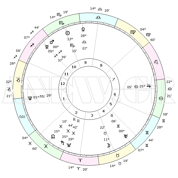 | | ΘΕΣΕΙΣ ΠΛΑΝΗΤΩΝ ΑΣΤΡΟΛΟΓΙΚΟΥ ΧΑΡΤΗ ΤΗΣ ΣΤΙΓΜΗΣ ΑΥΤΗΣ | | | | Πλανήτης | Ζώδιο | Μοίρες | Δεκαήμ. | Σε οίκο | Απόκλιση | | Ακμές των οίκων | | Ηλιος | Σκορπιός | 13°08' | Δεύτερο | 11 | 15 S 47 | | 1ος | 14°40' | Τοξότης | | Σελήνη | Ταύρος | 09°41' | Πρώτο | 5 | 18 N 33 | | 2ος | 18°17' | Αιγόκερως | | Ερμής | Τοξότης | 05°34' | Πρώτο | 12 | 23 S 59 | | 3ος | 26°26' | Υδροχόος | | Αφροδίτη | Ζυγός | 27°58' | Τρίτο | 10 | 09 S 26 | | 4ος | 02°11' | Κριός | | Αρης | Τοξότης | 00°34' | Πρώτο | 12 | 20 S 41 | | 5ος | 01°03' | Ταύρος | | Δίας | Καρκίνος | 25°05' | Τρίτο | 8 | 21 N 12 | | 6ος | 24°14' | Ταύρος | | Κρόνος | Ιχθείς | 25°44'R | Τρίτο | 3 | 03 S 57 | | 7ος | 14°40' | Δίδυμοι | | Ουρανός | Δίδυμοι | 00°06'R | Πρώτο | 6 | 19 N 58 | | 8ος | 18°17' | Καρκίνος | | Ποσειδώνας | Ιχθείς | 29°42'R | Τρίτο | 3 | 01 S 22 | | 9ος | 26°26' | Λέων | | Πλούτωνας | Υδροχόος | 01°29' | Πρώτο | 2 | 23 S 30 | | 10ος | 02°11' | Ζυγός | | Β. Δεσμός | Ιχθείς | 15°10' | Δεύτερο | 3 | 05 S 51 | | 11ος | 01°03' | Σκορπιός | | Ωροσκόπος | Τοξότης | 14°40' | Δεύτερο | | | 12ος | 24°14' | Σκορπιός | | Μεσουράνημα | Ζυγός | 02°11' | Πρώτο | | | |