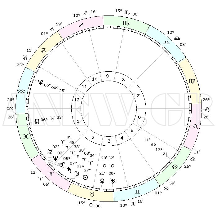 | | ΘΕΣΕΙΣ ΠΛΑΝΗΤΩΝ ΑΣΤΡΟΛΟΓΙΚΟΥ ΧΑΡΤΗ ΤΗΣ ΣΤΙΓΜΗΣ ΑΥΤΗΣ | | | | Πλανήτης | Ζώδιο | Μοίρες | Δεκαήμ. | Σε οίκο | Απόκλιση | | Ακμές των οίκων | | Ηλιος | Κριός | 27°00' | Τρίτο | 3 | 10 N 24 | | 1ος | 28°51' | Αιγόκερως | | Σελήνη | Κριός | 20°12' | Τρίτο | 2 | 11 N 05 | | 2ος | 12°45' | Ιχθείς | | Ερμής | Κριός | 02°40' | Πρώτο | 2 | 01 S 21 | | 3ος | 21°23' | Κριός | | Αφροδίτη | Ταύρος | 21°16' | Τρίτο | 4 | 18 N 20 | | 4ος | 20°02' | Ταύρος | | Αρης | Κριός | 05°35' | Πρώτο | 2 | 01 N 20 | | 5ος | 12°53' | Δίδυμοι | | Δίας | Καρκίνος | 17°11' | Δεύτερο | 6 | 22 N 42 | | 6ος | 04°16' | Καρκίνος | | Κρόνος | Κριός | 07°38' | Πρώτο | 2 | 01 N 03 | | 7ος | 28°51' | Καρκίνος | | Ουρανός | Ταύρος | 29°31' | Τρίτο | 4 | 19 N 53 | | 8ος | 12°45' | Παρθένος | | Ποσειδώνας | Κριός | 02°48' | Πρώτο | 2 | 00 S 06 | | 9ος | 21°23' | Ζυγός | | Πλούτωνας | Υδροχόος | 05°25' | Πρώτο | 1 | 22 S 47 | | 10ος | 20°02' | Σκορπιός | | Β. Δεσμός | Ιχθείς | 06°33' | Πρώτο | 1 | 09 S 06 | | 11ος | 12°53' | Τοξότης | | Ωροσκόπος | Αιγόκερως | 28°51' | Τρίτο | | | 12ος | 04°16' | Αιγόκερως | | Μεσουράνημα | Σκορπιός | 20°02' | Τρίτο | | | |