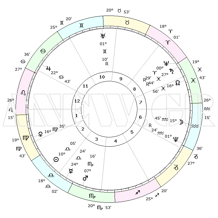 | ΘΕΣΕΙΣ ΠΛΑΝΗΤΩΝ ΑΣΤΡΟΛΟΓΙΚΟΥ ΧΑΡΤΗ ΤΗΣ ΣΤΙΓΜΗΣ ΑΥΤΗΣ | | Πλανήτης | Ζώδιο | Μοίρες | Δεκαήμ. | Σε οίκο | Απόκλιση | | Ακμές των οίκων | Ηλιος | Ζυγός | 10°01' | Δεύτερο | 3 | 03 S 58 | | 1ος | 08°33' | Λέων | Σελήνη | Υδροχόος | 14°56' | Δεύτερο | 7 | 19 S 07 | | 2ος | 00°15' | Παρθένος | Ερμής | Ζυγός | 24°18' | Τρίτο | 3 | 09 S 44 | | 3ος | 26°27' | Παρθένος | Αφροδίτη | Παρθένος | 16°31' | Δεύτερο | 2 | 06 N 33 | | 4ος | 28°24' | Ζυγός | Αρης | Σκορπιός | 07°13' | Πρώτο | 4 | 14 S 01 | | 5ος | 04°06' | Τοξότης | Δίας | Καρκίνος | 22°42' | Τρίτο | 12 | 21 N 33 | | 6ος | 08°27' | Αιγόκερως | Κρόνος | Ιχθείς | 27°44'R | Τρίτο | 9 | 03 S 12 | | 7ος | 08°33' | Υδροχόος | Ουρανός | Δίδυμοι | 01°10'R | Πρώτο | 10 | 20 N 11 | | 8ος | 00°15' | Ιχθείς | Ποσειδώνας | Κριός | 00°30'R | Πρώτο | 9 | 01 S 04 | | 9ος | 26°27' | Ιχθείς | Πλούτωνας | Υδροχόος | 01°24'R | Πρώτο | 6 | 23 S 32 | | 10ος | 28°24' | Κριός | Β. Δεσμός | Ιχθείς | 16°56' | Δεύτερο | 8 | 05 S 09 | | 11ος | 04°06' | Δίδυμοι | Ωροσκόπος | Λέων | 08°33' | Πρώτο | | | 12ος | 08°27' | Καρκίνος | Μεσουράνημα | Κριός | 28°24' | Τρίτο | | | |