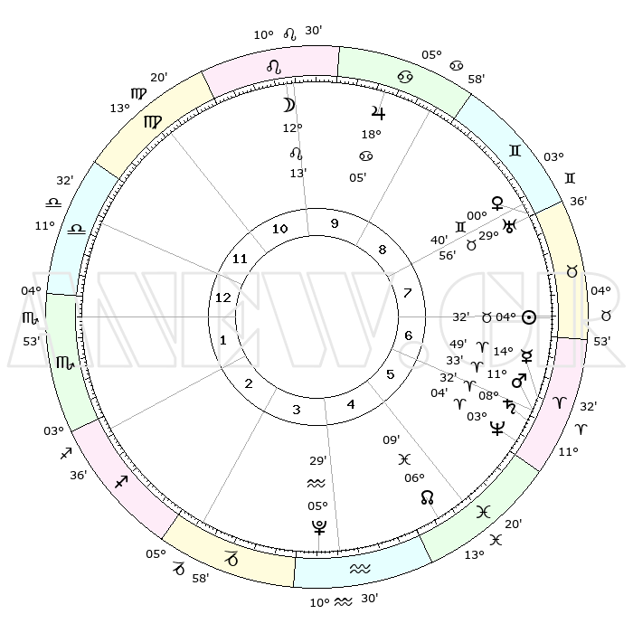 | | ΘΕΣΕΙΣ ΠΛΑΝΗΤΩΝ ΑΣΤΡΟΛΟΓΙΚΟΥ ΧΑΡΤΗ ΤΗΣ ΣΤΙΓΜΗΣ ΑΥΤΗΣ | | | | Πλανήτης | Ζώδιο | Μοίρες | Δεκαήμ. | Σε οίκο | Απόκλιση | | Ακμές των οίκων | | Ηλιος | Ταύρος | 04°29' | Πρώτο | 7 | 13 N 01 | | 1ος | 19°29' | Ζυγός | | Σελήνη | Λέων | 11°31' | Δεύτερο | 10 | 19 N 28 | | 2ος | 17°18' | Σκορπιός | | Ερμής | Κριός | 14°44' | Δεύτερο | 6 | 03 N 32 | | 3ος | 18°34' | Τοξότης | | Αφροδίτη | Δίδυμοι | 00°36' | Πρώτο | 8 | 20 N 52 | | 4ος | 22°08' | Αιγόκερως | | Αρης | Κριός | 11°31' | Δεύτερο | 6 | 03 N 42 | | 5ος | 25°05' | Υδροχόος | | Δίας | Καρκίνος | 18°05' | Δεύτερο | 9 | 22 N 36 | | 6ος | 24°34' | Ιχθείς | | Κρόνος | Κριός | 08°32' | Πρώτο | 6 | 01 N 24 | | 7ος | 19°29' | Κριός | | Ουρανός | Ταύρος | 29°56' | Τρίτο | 8 | 19 N 58 | | 8ος | 17°18' | Ταύρος | | Ποσειδώνας | Κριός | 03°03' | Πρώτο | 6 | 00 N 00 | | 9ος | 18°34' | Δίδυμοι | | Πλούτωνας | Υδροχόος | 05°29' | Πρώτο | 4 | 22 S 48 | | 10ος | 22°08' | Καρκίνος | | Β. Δεσμός | Ιχθείς | 06°09' | Πρώτο | 5 | 09 S 15 | | 11ος | 25°05' | Λέων | | Ωροσκόπος | Ζυγός | 19°29' | Δεύτερο | | | 12ος | 24°34' | Παρθένος | | Μεσουράνημα | Καρκίνος | 22°08' | Τρίτο | | | |