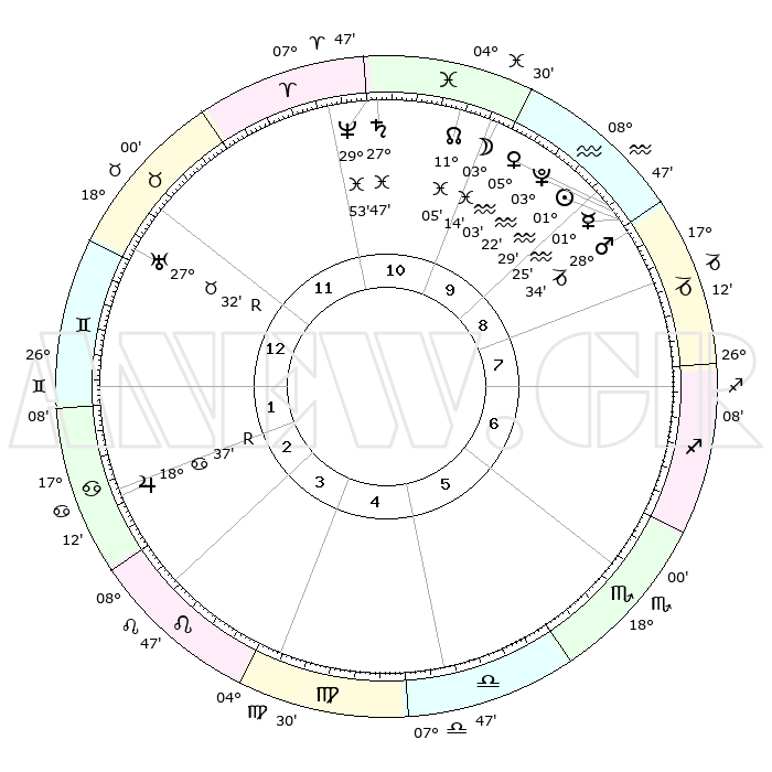 | | ΘΕΣΕΙΣ ΠΛΑΝΗΤΩΝ ΑΣΤΡΟΛΟΓΙΚΟΥ ΧΑΡΤΗ ΤΗΣ ΣΤΙΓΜΗΣ ΑΥΤΗΣ | | | | Πλανήτης | Ζώδιο | Μοίρες | Δεκαήμ. | Σε οίκο | Απόκλιση | | Ακμές των οίκων | | Ηλιος | Υδροχόος | 01°25' | Πρώτο | 9 | 19 S 50 | | 1ος | 00°44' | Δίδυμοι | | Σελήνη | Ιχθείς | 02°21' | Πρώτο | 10 | 11 S 14 | | 2ος | 25°24' | Δίδυμοι | | Ερμής | Υδροχόος | 01°18' | Πρώτο | 9 | 21 S 52 | | 3ος | 16°47' | Καρκίνος | | Αφροδίτη | Υδροχόος | 04°58' | Πρώτο | 9 | 20 S 08 | | 4ος | 09°36' | Λέων | | Αρης | Αιγόκερως | 28°31' | Τρίτο | 9 | 21 S 26 | | 5ος | 08°12' | Παρθένος | | Δίας | Καρκίνος | 18°38'R | Δεύτερο | 3 | 22 N 25 | | 6ος | 16°45' | Ζυγός | | Κρόνος | Ιχθείς | 27°47' | Τρίτο | 11 | 02 S 54 | | 7ος | 00°44' | Τοξότης | | Ουρανός | Ταύρος | 27°32'R | Τρίτο | 12 | 19 N 25 | | 8ος | 25°24' | Τοξότης | | Ποσειδώνας | Ιχθείς | 29°53' | Τρίτο | 11 | 01 S 16 | | 9ος | 16°47' | Αιγόκερως | | Πλούτωνας | Υδροχόος | 03°22' | Πρώτο | 9 | 23 S 05 | | 10ος | 09°36' | Υδροχόος | | Β. Δεσμός | Ιχθείς | 11°05' | Δεύτερο | 11 | 07 S 24 | | 11ος | 08°12' | Ιχθείς | | Ωροσκόπος | Δίδυμοι | 00°44' | Πρώτο | | | 12ος | 16°45' | Κριός | | Μεσουράνημα | Υδροχόος | 09°36' | Πρώτο | | | |