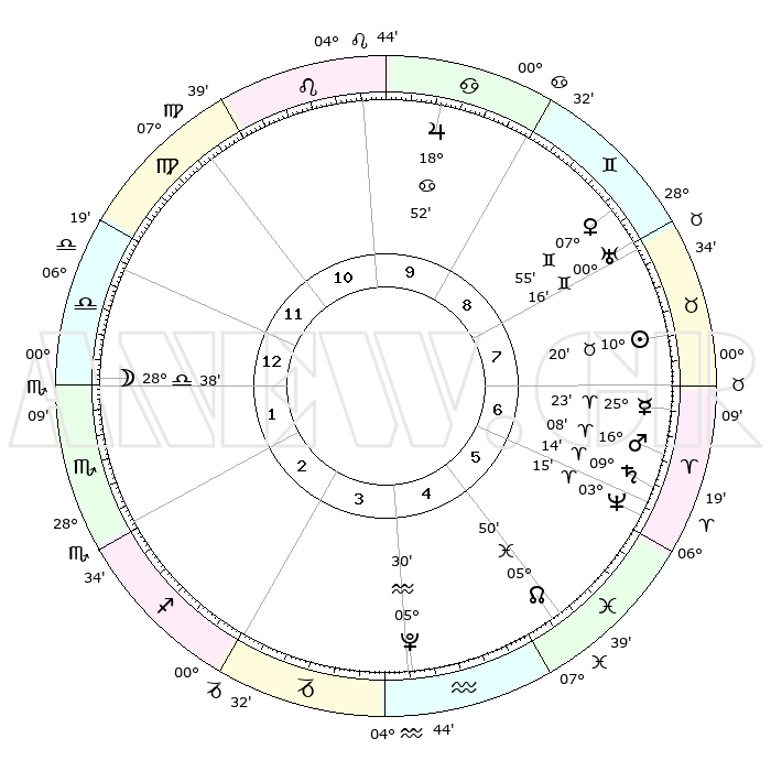 | | ΘΕΣΕΙΣ ΠΛΑΝΗΤΩΝ ΑΣΤΡΟΛΟΓΙΚΟΥ ΧΑΡΤΗ ΤΗΣ ΣΤΙΓΜΗΣ ΑΥΤΗΣ | | | | Πλανήτης | Ζώδιο | Μοίρες | Δεκαήμ. | Σε οίκο | Απόκλιση | | Ακμές των οίκων | | Ηλιος | Ταύρος | 10°18' | Δεύτερο | 7 | 14 N 54 | | 1ος | 16°58' | Ζυγός | | Σελήνη | Ζυγός | 28°05' | Τρίτο | 1 | 14 S 27 | | 2ος | 14°38' | Σκορπιός | | Ερμής | Κριός | 25°18' | Τρίτο | 7 | 07 N 58 | | 3ος | 15°46' | Τοξότης | | Αφροδίτη | Δίδυμοι | 07°51' | Πρώτο | 8 | 22 N 29 | | 4ος | 19°12' | Αιγόκερως | | Αρης | Κριός | 16°06' | Δεύτερο | 6 | 05 N 31 | | 5ος | 22°09' | Υδροχόος | | Δίας | Καρκίνος | 18°52' | Δεύτερο | 9 | 22 N 29 | | 6ος | 21°48' | Ιχθείς | | Κρόνος | Κριός | 09°13' | Πρώτο | 6 | 01 N 39 | | 7ος | 16°58' | Κριός | | Ουρανός | Δίδυμοι | 00°15' | Πρώτο | 8 | 20 N 02 | | 8ος | 14°38' | Ταύρος | | Ποσειδώνας | Κριός | 03°15' | Πρώτο | 6 | 00 N 05 | | 9ος | 15°46' | Δίδυμοι | | Πλούτωνας | Υδροχόος | 05°30' | Πρώτο | 4 | 22 S 49 | | 10ος | 19°12' | Καρκίνος | | Β. Δεσμός | Ιχθείς | 05°50' | Πρώτο | 5 | 09 S 22 | | 11ος | 22°09' | Λέων | | Ωροσκόπος | Ζυγός | 16°58' | Δεύτερο | | | 12ος | 21°48' | Παρθένος | | Μεσουράνημα | Καρκίνος | 19°12' | Δεύτερο | | | |