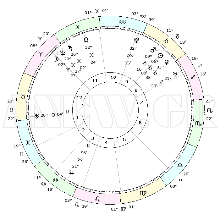 | | ΘΕΣΕΙΣ ΠΛΑΝΗΤΩΝ ΑΣΤΡΟΛΟΓΙΚΟΥ ΧΑΡΤΗ ΤΗΣ ΣΤΙΓΜΗΣ ΑΥΤΗΣ | | | | Πλανήτης | Ζώδιο | Μοίρες | Δεκαήμ. | Σε οίκο | Απόκλιση | | Ακμές των οίκων | | Ηλιος | Αιγόκερως | 05°55' | Πρώτο | 9 | 23 S 18 | | 1ος | 13°37' | Κριός | | Σελήνη | Κριός | 01°25' | Πρώτο | 12 | 02 N 10 | | 2ος | 20°23' | Ταύρος | | Ερμής | Τοξότης | 21°46' | Τρίτο | 9 | 23 S 13 | | 3ος | 15°51' | Δίδυμοι | | Αφροδίτη | Αιγόκερως | 03°29' | Πρώτο | 9 | 23 S 43 | | 4ος | 07°42' | Καρκίνος | | Αρης | Αιγόκερως | 09°13' | Πρώτο | 10 | 23 S 58 | | 5ος | 00°45' | Λέων | | Δίας | Καρκίνος | 21°56'R | Τρίτο | 4 | 21 N 52 | | 6ος | 00°24' | Παρθένος | | Κρόνος | Ιχθείς | 26°02' | Τρίτο | 12 | 03 S 40 | | 7ος | 13°37' | Ζυγός | | Ουρανός | Ταύρος | 28°05'R | Τρίτο | 2 | 19 N 32 | | 8ος | 20°23' | Σκορπιός | | Ποσειδώνας | Ιχθείς | 29°27' | Τρίτο | 12 | 01 S 26 | | 9ος | 15°51' | Τοξότης | | Πλούτωνας | Υδροχόος | 02°35' | Πρώτο | 11 | 23 S 15 | | 10ος | 07°42' | Αιγόκερως | | Β. Δεσμός | Ιχθείς | 12°25' | Δεύτερο | 12 | 06 S 54 | | 11ος | 00°45' | Υδροχόος | | Ωροσκόπος | Κριός | 13°37' | Δεύτερο | | | 12ος | 00°24' | Ιχθείς | | Μεσουράνημα | Αιγόκερως | 07°42' | Πρώτο | | | |