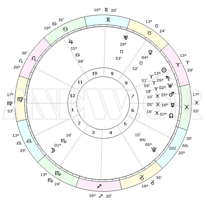 | | ΘΕΣΕΙΣ ΠΛΑΝΗΤΩΝ ΑΣΤΡΟΛΟΓΙΚΟΥ ΧΑΡΤΗ ΤΗΣ ΣΤΙΓΜΗΣ ΑΥΤΗΣ | | | | Πλανήτης | Ζώδιο | Μοίρες | Δεκαήμ. | Σε οίκο | Απόκλιση | | Ακμές των οίκων | | Ηλιος | Κριός | 13°48' | Δεύτερο | 8 | 05 N 26 | | 1ος | 28°59' | Λέων | | Σελήνη | Σκορπιός | 00°28' | Πρώτο | 3 | 15 S 27 | | 2ος | 22°44' | Παρθένος | | Ερμής | Ιχθείς | 16°01' | Δεύτερο | 7 | 07 S 03 | | 3ος | 21°18' | Ζυγός | | Αφροδίτη | Ταύρος | 04°47' | Πρώτο | 9 | 12 N 48 | | 4ος | 24°12' | Σκορπιός | | Αρης | Ιχθείς | 25°07' | Τρίτο | 8 | 02 S 53 | | 5ος | 28°28' | Τοξότης | | Δίας | Καρκίνος | 15°57' | Δεύτερο | 11 | 22 N 51 | | 6ος | 00°30' | Υδροχόος | | Κρόνος | Κριός | 05°59' | Πρώτο | 8 | 00 N 25 | | 7ος | 28°59' | Υδροχόος | | Ουρανός | Ταύρος | 28°53' | Τρίτο | 10 | 19 N 44 | | 8ος | 22°44' | Ιχθείς | | Ποσειδώνας | Κριός | 02°18' | Πρώτο | 8 | 00 S 17 | | 9ος | 21°18' | Κριός | | Πλούτωνας | Υδροχόος | 05°15' | Πρώτο | 6 | 22 S 47 | | 10ος | 24°12' | Ταύρος | | Β. Δεσμός | Ιχθείς | 07°16' | Πρώτο | 7 | 08 S 50 | | 11ος | 28°28' | Δίδυμοι | | Ωροσκόπος | Λέων | 28°59' | Τρίτο | | | 12ος | 00°30' | Λέων | | Μεσουράνημα | Ταύρος | 24°12' | Τρίτο | | | |