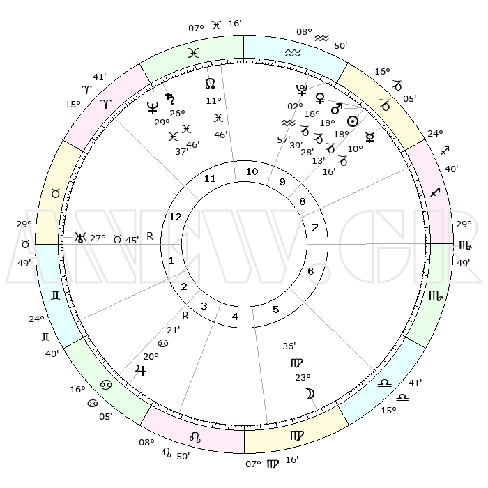| | ΘΕΣΕΙΣ ΠΛΑΝΗΤΩΝ ΑΣΤΡΟΛΟΓΙΚΟΥ ΧΑΡΤΗ ΤΗΣ ΣΤΙΓΜΗΣ ΑΥΤΗΣ | | | | Πλανήτης | Ζώδιο | Μοίρες | Δεκαήμ. | Σε οίκο | Απόκλιση | | Ακμές των οίκων | | Ηλιος | Αιγόκερως | 16°59' | Δεύτερο | 12 | 22 S 21 | | 1ος | 10°49' | Υδροχόος | | Σελήνη | Παρθένος | 07°56' | Πρώτο | 7 | 08 N 47 | | 2ος | 26°15' | Ιχθείς | | Ερμής | Αιγόκερως | 08°23' | Πρώτο | 11 | 24 S 22 | | 3ος | 02°47' | Ταύρος | | Αφροδίτη | Αιγόκερως | 17°08' | Δεύτερο | 12 | 23 S 04 | | 4ος | 29°32' | Ταύρος | | Αρης | Αιγόκερως | 17°32' | Δεύτερο | 12 | 23 S 12 | | 5ος | 21°39' | Δίδυμοι | | Δίας | Καρκίνος | 20°31'R | Τρίτο | 6 | 22 N 07 | | 6ος | 13°37' | Καρκίνος | | Κρόνος | Ιχθείς | 26°41' | Τρίτο | 2 | 03 S 22 | | 7ος | 10°49' | Λέων | | Ουρανός | Ταύρος | 27°47'R | Τρίτο | 3 | 19 N 28 | | 8ος | 26°15' | Παρθένος | | Ποσειδώνας | Ιχθείς | 29°36' | Τρίτο | 2 | 01 S 23 | | 9ος | 02°47' | Σκορπιός | | Πλούτωνας | Υδροχόος | 02°55' | Πρώτο | 12 | 23 S 11 | | 10ος | 29°32' | Σκορπιός | | Β. Δεσμός | Ιχθείς | 11°50' | Δεύτερο | 1 | 07 S 07 | | 11ος | 21°39' | Τοξότης | | Ωροσκόπος | Υδροχόος | 10°49' | Δεύτερο | | | 12ος | 13°37' | Αιγόκερως | | Μεσουράνημα | Σκορπιός | 29°32' | Τρίτο | | | |