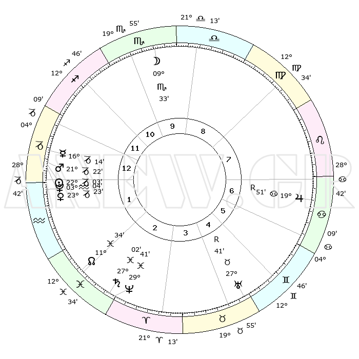 | | ΘΕΣΕΙΣ ΠΛΑΝΗΤΩΝ ΑΣΤΡΟΛΟΓΙΚΟΥ ΧΑΡΤΗ ΤΗΣ ΣΤΙΓΜΗΣ ΑΥΤΗΣ | | | | Πλανήτης | Ζώδιο | Μοίρες | Δεκαήμ. | Σε οίκο | Απόκλιση | | Ακμές των οίκων | | Ηλιος | Αιγόκερως | 21°59' | Τρίτο | 1 | 21 S 38 | | 1ος | 04°07' | Αιγόκερως | | Σελήνη | Σκορπιός | 08°46' | Πρώτο | 10 | 18 S 33 | | 2ος | 12°18' | Υδροχόος | | Ερμής | Αιγόκερως | 16°07' | Δεύτερο | 1 | 24 S 03 | | 3ος | 22°32' | Ιχθείς | | Αφροδίτη | Αιγόκερως | 23°18' | Τρίτο | 1 | 22 S 18 | | 4ος | 25°47' | Κριός | | Αρης | Αιγόκερως | 21°19' | Τρίτο | 1 | 22 S 41 | | 5ος | 21°28' | Ταύρος | | Δίας | Καρκίνος | 19°51'R | Δεύτερο | 7 | 22 N 14 | | 6ος | 13°02' | Δίδυμοι | | Κρόνος | Ιχθείς | 27°02' | Τρίτο | 3 | 03 S 13 | | 7ος | 04°07' | Καρκίνος | | Ουρανός | Ταύρος | 27°41'R | Τρίτο | 5 | 19 N 27 | | 8ος | 12°18' | Λέων | | Ποσειδώνας | Ιχθείς | 29°41' | Τρίτο | 3 | 01 S 21 | | 9ος | 22°32' | Παρθένος | | Πλούτωνας | Υδροχόος | 03°04' | Πρώτο | 1 | 23 S 09 | | 10ος | 25°47' | Ζυγός | | Β. Δεσμός | Ιχθείς | 11°35' | Δεύτερο | 2 | 07 S 13 | | 11ος | 21°28' | Σκορπιός | | Ωροσκόπος | Αιγόκερως | 04°07' | Πρώτο | | | 12ος | 13°02' | Τοξότης | | Μεσουράνημα | Ζυγός | 25°47' | Τρίτο | | | |