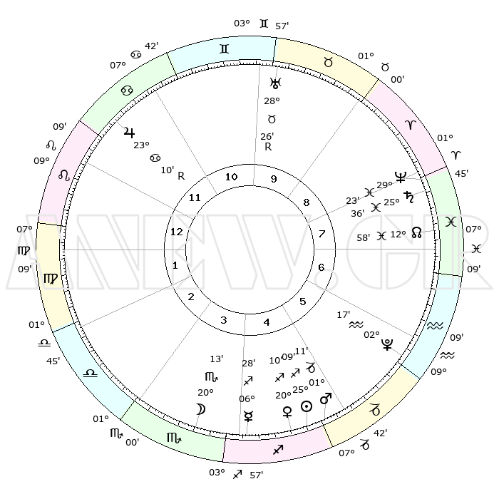 | | ΘΕΣΕΙΣ ΠΛΑΝΗΤΩΝ ΑΣΤΡΟΛΟΓΙΚΟΥ ΧΑΡΤΗ ΤΗΣ ΣΤΙΓΜΗΣ ΑΥΤΗΣ | | | | Πλανήτης | Ζώδιο | Μοίρες | Δεκαήμ. | Σε οίκο | Απόκλιση | | Ακμές των οίκων | | Ηλιος | Τοξότης | 24°48' | Τρίτο | 8 | 23 S 20 | | 1ος | 11°45' | Ταύρος | | Σελήνη | Σκορπιός | 16°08' | Δεύτερο | 7 | 20 S 57 | | 2ος | 10°49' | Δίδυμοι | | Ερμής | Τοξότης | 05°59' | Πρώτο | 7 | 19 S 59 | | 3ος | 03°18' | Καρκίνος | | Αφροδίτη | Τοξότης | 19°44' | Δεύτερο | 8 | 22 S 56 | | 4ος | 25°10' | Καρκίνος | | Αρης | Αιγόκερως | 00°55' | Πρώτο | 8 | 24 S 13 | | 5ος | 20°53' | Λέων | | Δίας | Καρκίνος | 23°12'R | Τρίτο | 3 | 21 N 38 | | 6ος | 25°58' | Παρθένος | | Κρόνος | Ιχθείς | 25°35' | Τρίτο | 11 | 03 S 53 | | 7ος | 11°45' | Σκορπιός | | Ουρανός | Ταύρος | 28°26'R | Τρίτο | 1 | 19 N 37 | | 8ος | 10°49' | Τοξότης | | Ποσειδώνας | Ιχθείς | 29°23' | Τρίτο | 12 | 01 S 29 | | 9ος | 03°18' | Αιγόκερως | | Πλούτωνας | Υδροχόος | 02°17' | Πρώτο | 10 | 23 S 19 | | 10ος | 25°10' | Αιγόκερως | | Β. Δεσμός | Ιχθείς | 12°59' | Δεύτερο | 11 | 06 S 41 | | 11ος | 20°53' | Υδροχόος | | Ωροσκόπος | Ταύρος | 11°45' | Δεύτερο | | | 12ος | 25°58' | Ιχθείς | | Μεσουράνημα | Αιγόκερως | 25°10' | Τρίτο | | | |