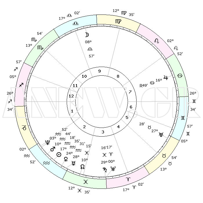 | | ΘΕΣΕΙΣ ΠΛΑΝΗΤΩΝ ΑΣΤΡΟΛΟΓΙΚΟΥ ΧΑΡΤΗ ΤΗΣ ΣΤΙΓΜΗΣ ΑΥΤΗΣ | | | | Πλανήτης | Ζώδιο | Μοίρες | Δεκαήμ. | Σε οίκο | Απόκλιση | | Ακμές των οίκων | | Ηλιος | Υδροχόος | 17°14' | Δεύτερο | 3 | 15 S 40 | | 1ος | 06°15' | Τοξότης | | Σελήνη | Ζυγός | 08°07' | Πρώτο | 10 | 05 S 34 | | 2ος | 08°20' | Αιγόκερως | | Ερμής | Υδροχόος | 28°24' | Τρίτο | 3 | 13 S 23 | | 3ος | 15°05' | Υδροχόος | | Αφροδίτη | Υδροχόος | 24°30' | Τρίτο | 3 | 14 S 42 | | 4ος | 21°10' | Ιχθείς | | Αρης | Υδροχόος | 10°41' | Δεύτερο | 2 | 18 S 34 | | 5ος | 21°21' | Κριός | | Δίας | Καρκίνος | 16°49'R | Δεύτερο | 8 | 22 N 41 | | 6ος | 15°34' | Ταύρος | | Κρόνος | Ιχθείς | 29°16' | Τρίτο | 4 | 02 S 17 | | 7ος | 06°15' | Δίδυμοι | | Ουρανός | Ταύρος | 27°28' | Τρίτο | 6 | 19 N 24 | | 8ος | 08°20' | Καρκίνος | | Ποσειδώνας | Κριός | 00°17' | Πρώτο | 4 | 01 S 05 | | 9ος | 15°05' | Λέων | | Πλούτωνας | Υδροχόος | 03°52' | Πρώτο | 2 | 23 S 00 | | 10ος | 21°10' | Παρθένος | | Β. Δεσμός | Ιχθείς | 10°16' | Δεύτερο | 3 | 07 S 43 | | 11ος | 21°21' | Ζυγός | | Ωροσκόπος | Τοξότης | 06°15' | Πρώτο | | | 12ος | 15°34' | Σκορπιός | | Μεσουράνημα | Παρθένος | 21°10' | Τρίτο | | | |