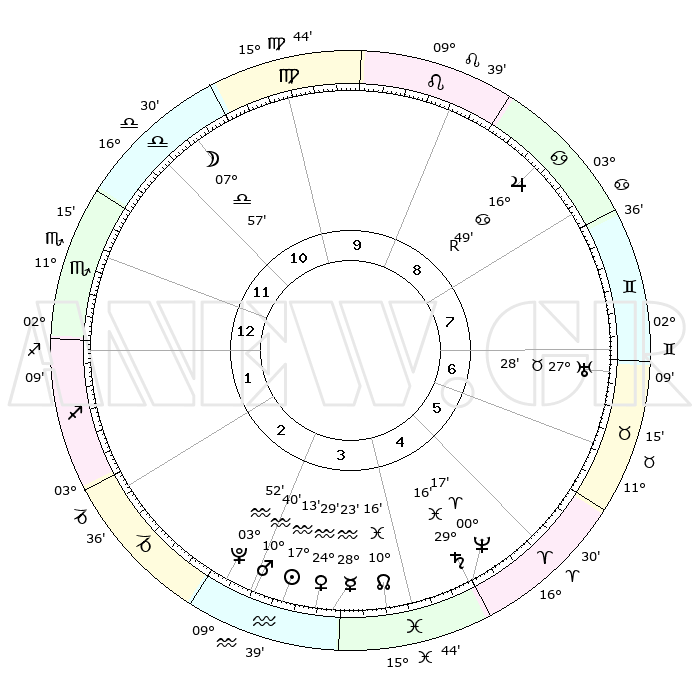 | | ΘΕΣΕΙΣ ΠΛΑΝΗΤΩΝ ΑΣΤΡΟΛΟΓΙΚΟΥ ΧΑΡΤΗ ΤΗΣ ΣΤΙΓΜΗΣ ΑΥΤΗΣ | | | | Πλανήτης | Ζώδιο | Μοίρες | Δεκαήμ. | Σε οίκο | Απόκλιση | | Ακμές των οίκων | | Ηλιος | Υδροχόος | 17°09' | Δεύτερο | 3 | 15 S 41 | | 1ος | 12°47' | Σκορπιός | | Σελήνη | Ζυγός | 07°06' | Πρώτο | 11 | 05 S 05 | | 2ος | 12°05' | Τοξότης | | Ερμής | Υδροχόος | 28°15' | Τρίτο | 4 | 13 S 27 | | 3ος | 15°18' | Αιγόκερως | | Αφροδίτη | Υδροχόος | 24°24' | Τρίτο | 4 | 14 S 44 | | 4ος | 20°24' | Υδροχόος | | Αρης | Υδροχόος | 10°37' | Δεύτερο | 3 | 18 S 35 | | 5ος | 22°57' | Ιχθείς | | Δίας | Καρκίνος | 16°50'R | Δεύτερο | 9 | 22 N 41 | | 6ος | 20°16' | Κριός | | Κρόνος | Ιχθείς | 29°15' | Τρίτο | 5 | 02 S 17 | | 7ος | 12°47' | Ταύρος | | Ουρανός | Ταύρος | 27°28' | Τρίτο | 7 | 19 N 24 | | 8ος | 12°05' | Δίδυμοι | | Ποσειδώνας | Κριός | 00°17' | Πρώτο | 5 | 01 S 06 | | 9ος | 15°18' | Καρκίνος | | Πλούτωνας | Υδροχόος | 03°51' | Πρώτο | 3 | 23 S 00 | | 10ος | 20°24' | Λέων | | Β. Δεσμός | Ιχθείς | 10°16' | Δεύτερο | 4 | 07 S 43 | | 11ος | 22°57' | Παρθένος | | Ωροσκόπος | Σκορπιός | 12°47' | Δεύτερο | | | 12ος | 20°16' | Ζυγός | | Μεσουράνημα | Λέων | 20°24' | Τρίτο | | | |