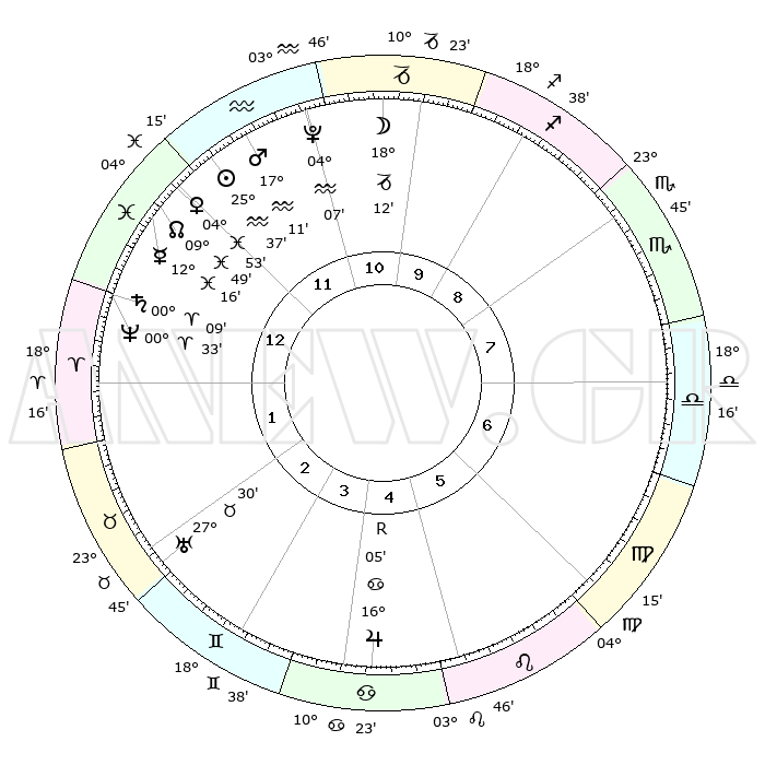 | | ΘΕΣΕΙΣ ΠΛΑΝΗΤΩΝ ΑΣΤΡΟΛΟΓΙΚΟΥ ΧΑΡΤΗ ΤΗΣ ΣΤΙΓΜΗΣ ΑΥΤΗΣ | | | | Πλανήτης | Ζώδιο | Μοίρες | Δεκαήμ. | Σε οίκο | Απόκλιση | | Ακμές των οίκων | | Ηλιος | Υδροχόος | 25°32' | Τρίτο | 12 | 13 S 00 | | 1ος | 03°14' | Ιχθείς | | Σελήνη | Αιγόκερως | 17°14' | Δεύτερο | 11 | 26 S 26 | | 2ος | 18°22' | Κριός | | Ερμής | Ιχθείς | 12°09' | Δεύτερο | 1 | 07 S 07 | | 3ος | 20°27' | Ταύρος | | Αφροδίτη | Ιχθείς | 04°47' | Πρώτο | 1 | 11 S 07 | | 4ος | 14°32' | Δίδυμοι | | Αρης | Υδροχόος | 17°08' | Δεύτερο | 12 | 16 S 44 | | 5ος | 06°13' | Καρκίνος | | Δίας | Καρκίνος | 16°05'R | Δεύτερο | 5 | 22 N 47 | | 6ος | 00°07' | Λέων | | Κρόνος | Κριός | 00°08' | Πρώτο | 1 | 01 S 55 | | 7ος | 03°14' | Παρθένος | | Ουρανός | Ταύρος | 27°30' | Τρίτο | 3 | 19 N 25 | | 8ος | 18°22' | Ζυγός | | Ποσειδώνας | Κριός | 00°33' | Πρώτο | 1 | 00 S 59 | | 9ος | 20°27' | Σκορπιός | | Πλούτωνας | Υδροχόος | 04°07' | Πρώτο | 12 | 22 S 57 | | 10ος | 14°32' | Τοξότης | | Β. Δεσμός | Ιχθείς | 09°50' | Πρώτο | 1 | 07 S 53 | | 11ος | 06°13' | Αιγόκερως | | Ωροσκόπος | Ιχθείς | 03°14' | Πρώτο | | | 12ος | 00°07' | Υδροχόος | | Μεσουράνημα | Τοξότης | 14°32' | Δεύτερο | | | |