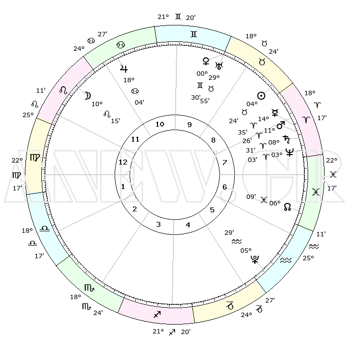 | | ΘΕΣΕΙΣ ΠΛΑΝΗΤΩΝ ΑΣΤΡΟΛΟΓΙΚΟΥ ΧΑΡΤΗ ΤΗΣ ΣΤΙΓΜΗΣ ΑΥΤΗΣ | | | | Πλανήτης | Ζώδιο | Μοίρες | Δεκαήμ. | Σε οίκο | Απόκλιση | | Ακμές των οίκων | | Ηλιος | Ταύρος | 04°19' | Πρώτο | 9 | 12 N 57 | | 1ος | 00°43' | Παρθένος | | Σελήνη | Λέων | 09°15' | Πρώτο | 12 | 20 N 15 | | 2ος | 24°38' | Παρθένος | | Ερμής | Κριός | 14°27' | Δεύτερο | 8 | 03 N 26 | | 3ος | 23°23' | Ζυγός | | Αφροδίτη | Δίδυμοι | 00°24' | Πρώτο | 10 | 20 N 49 | | 4ος | 26°18' | Σκορπιός | | Αρης | Κριός | 11°23' | Δεύτερο | 8 | 03 N 39 | | 5ος | 00°27' | Αιγόκερως | | Δίας | Καρκίνος | 18°03' | Δεύτερο | 11 | 22 N 36 | | 6ος | 02°20' | Υδροχόος | | Κρόνος | Κριός | 08°31' | Πρώτο | 8 | 01 N 23 | | 7ος | 00°43' | Ιχθείς | | Ουρανός | Ταύρος | 29°55' | Τρίτο | 10 | 19 N 58 | | 8ος | 24°38' | Ιχθείς | | Ποσειδώνας | Κριός | 03°03' | Πρώτο | 8 | 00 N 00 | | 9ος | 23°23' | Κριός | | Πλούτωνας | Υδροχόος | 05°28' | Πρώτο | 6 | 22 S 48 | | 10ος | 26°18' | Ταύρος | | Β. Δεσμός | Ιχθείς | 06°10' | Πρώτο | 7 | 09 S 15 | | 11ος | 00°27' | Καρκίνος | | Ωροσκόπος | Παρθένος | 00°43' | Πρώτο | | | 12ος | 02°20' | Λέων | | Μεσουράνημα | Ταύρος | 26°18' | Τρίτο | | | |