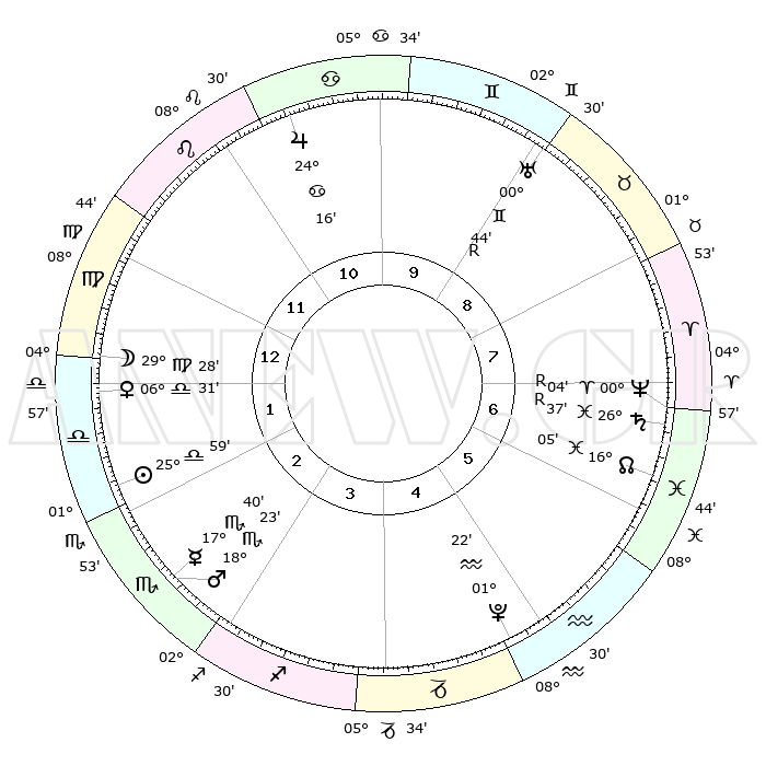 | ΘΕΣΕΙΣ ΠΛΑΝΗΤΩΝ ΑΣΤΡΟΛΟΓΙΚΟΥ ΧΑΡΤΗ ΤΗΣ ΣΤΙΓΜΗΣ ΑΥΤΗΣ | | Πλανήτης | Ζώδιο | Μοίρες | Δεκαήμ. | Σε οίκο | Απόκλιση | | Ακμές των οίκων | Ηλιος | Ζυγός | 25°41' | Τρίτο | 5 | 09 S 56 | | 1ος | 06°17' | Καρκίνος | Σελήνη | Παρθένος | 25°47' | Τρίτο | 4 | 01 N 02 | | 2ος | 26°48' | Καρκίνος | Ερμής | Σκορπιός | 17°16' | Δεύτερο | 5 | 19 S 01 | | 3ος | 19°05' | Λέων | Αφροδίτη | Ζυγός | 06°09' | Πρώτο | 4 | 01 S 02 | | 4ος | 16°26' | Παρθένος | Αρης | Σκορπιός | 18°10' | Δεύτερο | 5 | 17 S 29 | | 5ος | 21°16' | Ζυγός | Δίας | Καρκίνος | 24°14' | Τρίτο | 1 | 21 N 19 | | 6ος | 00°41' | Τοξότης | Κρόνος | Ιχθείς | 26°38'R | Τρίτο | 10 | 03 S 38 | | 7ος | 06°17' | Αιγόκερως | Ουρανός | Δίδυμοι | 00°44'R | Πρώτο | 12 | 20 N 06 | | 8ος | 26°48' | Αιγόκερως | Ποσειδώνας | Κριός | 00°05'R | Πρώτο | 10 | 01 S 14 | | 9ος | 19°05' | Υδροχόος | Πλούτωνας | Υδροχόος | 01°22' | Πρώτο | 8 | 23 S 32 | | 10ος | 16°26' | Ιχθείς | Β. Δεσμός | Ιχθείς | 16°06' | Δεύτερο | 9 | 05 S 29 | | 11ος | 21°16' | Κριός | Ωροσκόπος | Καρκίνος | 06°17' | Πρώτο | | | 12ος | 00°41' | Δίδυμοι | Μεσουράνημα | Ιχθείς | 16°26' | Δεύτερο | | | |