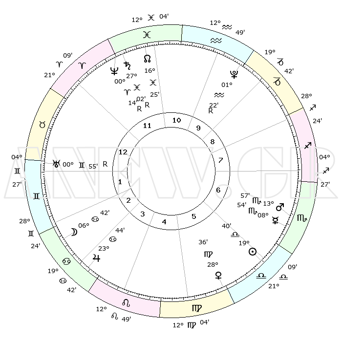 | ΘΕΣΕΙΣ ΠΛΑΝΗΤΩΝ ΑΣΤΡΟΛΟΓΙΚΟΥ ΧΑΡΤΗ ΤΗΣ ΣΤΙΓΜΗΣ ΑΥΤΗΣ | | Πλανήτης | Ζώδιο | Μοίρες | Δεκαήμ. | Σε οίκο | Απόκλιση | | Ακμές των οίκων | Ηλιος | Ζυγός | 19°34' | Δεύτερο | 7 | 07 S 39 | | 1ος | 17°41' | Κριός | Σελήνη | Καρκίνος | 05°22' | Πρώτο | 3 | 28 N 18 | | 2ος | 23°20' | Ταύρος | Ερμής | Σκορπιός | 08°46' | Πρώτο | 7 | 15 S 49 | | 3ος | 18°17' | Δίδυμοι | Αφροδίτη | Παρθένος | 28°29' | Τρίτο | 6 | 01 N 58 | | 4ος | 10°03' | Καρκίνος | Αρης | Σκορπιός | 13°53' | Δεύτερο | 7 | 16 S 11 | | 5ος | 03°23' | Λέων | Δίας | Καρκίνος | 23°43' | Τρίτο | 4 | 21 N 24 | | 6ος | 03°45' | Παρθένος | Κρόνος | Ιχθείς | 27°03'R | Τρίτο | 12 | 03 S 28 | | 7ος | 17°41' | Ζυγός | Ουρανός | Δίδυμοι | 00°55'R | Πρώτο | 2 | 20 N 08 | | 8ος | 23°20' | Σκορπιός | Ποσειδώνας | Κριός | 00°14'R | Πρώτο | 12 | 01 S 10 | | 9ος | 18°17' | Τοξότης | Πλούτωνας | Υδροχόος | 01°22'R | Πρώτο | 10 | 23 S 32 | | 10ος | 10°03' | Αιγόκερως | Β. Δεσμός | Ιχθείς | 16°25' | Δεύτερο | 12 | 05 S 21 | | 11ος | 03°23' | Υδροχόος | Ωροσκόπος | Κριός | 17°41' | Δεύτερο | | | 12ος | 03°45' | Ιχθείς | Μεσουράνημα | Αιγόκερως | 10°03' | Δεύτερο | | | |