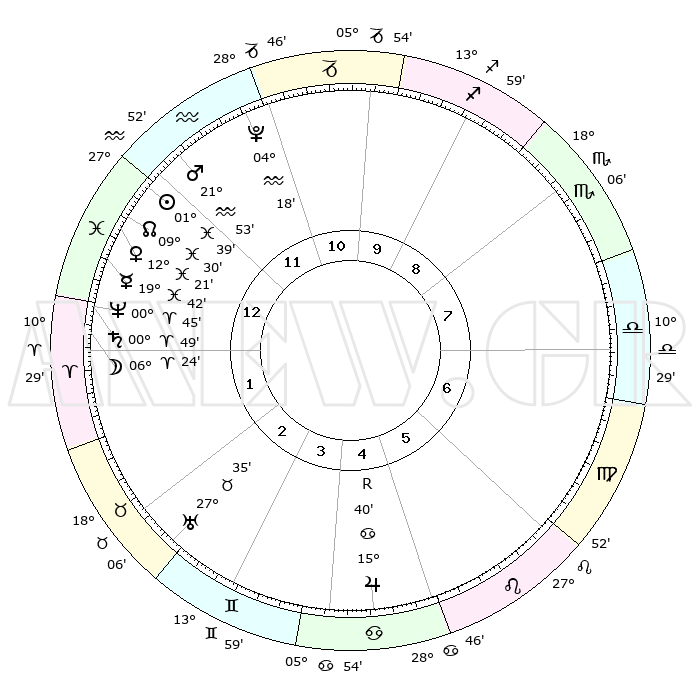 | | ΘΕΣΕΙΣ ΠΛΑΝΗΤΩΝ ΑΣΤΡΟΛΟΓΙΚΟΥ ΧΑΡΤΗ ΤΗΣ ΣΤΙΓΜΗΣ ΑΥΤΗΣ | | | | Πλανήτης | Ζώδιο | Μοίρες | Δεκαήμ. | Σε οίκο | Απόκλιση | | Ακμές των οίκων | | Ηλιος | Ιχθείς | 01°33' | Πρώτο | 1 | 10 S 55 | | 1ος | 20°17' | Υδροχόος | | Σελήνη | Κριός | 05°11' | Πρώτο | 1 | 04 N 13 | | 2ος | 06°05' | Κριός | | Ερμής | Ιχθείς | 19°37' | Δεύτερο | 1 | 02 S 55 | | 3ος | 10°45' | Ταύρος | | Αφροδίτη | Ιχθείς | 12°14' | Δεύτερο | 1 | 08 S 19 | | 4ος | 06°13' | Δίδυμοι | | Αρης | Υδροχόος | 21°49' | Τρίτο | 1 | 15 S 16 | | 5ος | 28°02' | Δίδυμοι | | Δίας | Καρκίνος | 15°40'R | Δεύτερο | 5 | 22 N 51 | | 6ος | 20°41' | Καρκίνος | | Κρόνος | Κριός | 00°49' | Πρώτο | 1 | 01 S 39 | | 7ος | 20°17' | Λέων | | Ουρανός | Ταύρος | 27°34' | Τρίτο | 3 | 19 N 26 | | 8ος | 06°05' | Ζυγός | | Ποσειδώνας | Κριός | 00°44' | Πρώτο | 1 | 00 S 54 | | 9ος | 10°45' | Σκορπιός | | Πλούτωνας | Υδροχόος | 04°17' | Πρώτο | 12 | 22 S 55 | | 10ος | 06°13' | Τοξότης | | Β. Δεσμός | Ιχθείς | 09°31' | Πρώτο | 1 | 08 S 00 | | 11ος | 28°02' | Τοξότης | | Ωροσκόπος | Υδροχόος | 20°17' | Τρίτο | | | 12ος | 20°41' | Αιγόκερως | | Μεσουράνημα | Τοξότης | 06°13' | Πρώτο | | | |