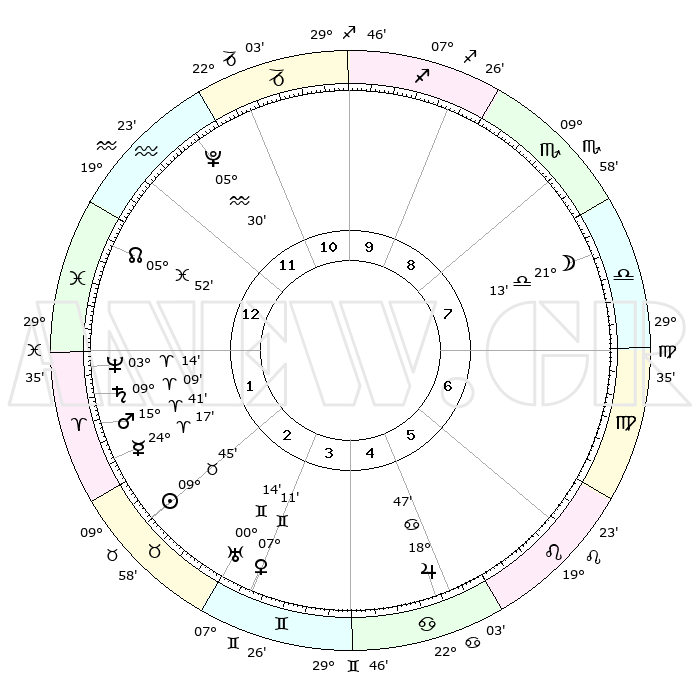 | | ΘΕΣΕΙΣ ΠΛΑΝΗΤΩΝ ΑΣΤΡΟΛΟΓΙΚΟΥ ΧΑΡΤΗ ΤΗΣ ΣΤΙΓΜΗΣ ΑΥΤΗΣ | | | | Πλανήτης | Ζώδιο | Μοίρες | Δεκαήμ. | Σε οίκο | Απόκλιση | | Ακμές των οίκων | | Ηλιος | Ταύρος | 09°43' | Πρώτο | 2 | 14 N 43 | | 1ος | 05°07' | Ιχθείς | | Σελήνη | Ζυγός | 20°42' | Τρίτο | 8 | 11 S 19 | | 2ος | 20°02' | Κριός | | Ερμής | Κριός | 24°12' | Τρίτο | 2 | 07 N 30 | | 3ος | 21°45' | Ταύρος | | Αφροδίτη | Δίδυμοι | 07°08' | Πρώτο | 3 | 22 N 20 | | 4ος | 15°41' | Δίδυμοι | | Αρης | Κριός | 15°39' | Δεύτερο | 1 | 05 N 20 | | 5ος | 07°22' | Καρκίνος | | Δίας | Καρκίνος | 18°47' | Δεύτερο | 5 | 22 N 30 | | 6ος | 01°28' | Λέων | | Κρόνος | Κριός | 09°09' | Πρώτο | 1 | 01 N 38 | | 7ος | 05°07' | Παρθένος | | Ουρανός | Δίδυμοι | 00°13' | Πρώτο | 3 | 20 N 02 | | 8ος | 20°02' | Ζυγός | | Ποσειδώνας | Κριός | 03°14' | Πρώτο | 1 | 00 N 04 | | 9ος | 21°45' | Σκορπιός | | Πλούτωνας | Υδροχόος | 05°30' | Πρώτο | 12 | 22 S 49 | | 10ος | 15°41' | Τοξότης | | Β. Δεσμός | Ιχθείς | 05°52' | Πρώτο | 1 | 09 S 21 | | 11ος | 07°22' | Αιγόκερως | | Ωροσκόπος | Ιχθείς | 05°07' | Πρώτο | | | 12ος | 01°28' | Υδροχόος | | Μεσουράνημα | Τοξότης | 15°41' | Δεύτερο | | | |