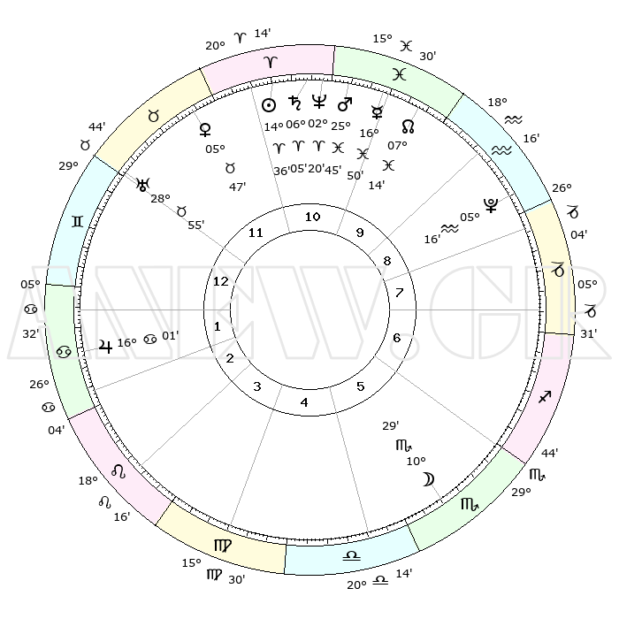 | | ΘΕΣΕΙΣ ΠΛΑΝΗΤΩΝ ΑΣΤΡΟΛΟΓΙΚΟΥ ΧΑΡΤΗ ΤΗΣ ΣΤΙΓΜΗΣ ΑΥΤΗΣ | | | | Πλανήτης | Ζώδιο | Μοίρες | Δεκαήμ. | Σε οίκο | Απόκλιση | | Ακμές των οίκων | | Ηλιος | Κριός | 14°31' | Δεύτερο | 11 | 05 N 43 | | 1ος | 06°28' | Δίδυμοι | | Σελήνη | Σκορπιός | 09°29' | Πρώτο | 6 | 18 S 56 | | 2ος | 00°03' | Καρκίνος | | Ερμής | Ιχθείς | 16°45' | Δεύτερο | 11 | 06 S 51 | | 3ος | 21°18' | Καρκίνος | | Αφροδίτη | Ταύρος | 05°41' | Πρώτο | 12 | 13 N 08 | | 4ος | 14°36' | Λέων | | Αρης | Ιχθείς | 25°41' | Τρίτο | 11 | 02 S 40 | | 5ος | 14°13' | Παρθένος | | Δίας | Καρκίνος | 16°01' | Δεύτερο | 2 | 22 N 51 | | 6ος | 23°34' | Ζυγός | | Κρόνος | Κριός | 06°04' | Πρώτο | 11 | 00 N 27 | | 7ος | 06°28' | Τοξότης | | Ουρανός | Ταύρος | 28°55' | Τρίτο | 12 | 19 N 45 | | 8ος | 00°03' | Αιγόκερως | | Ποσειδώνας | Κριός | 02°20' | Πρώτο | 11 | 00 S 16 | | 9ος | 21°18' | Αιγόκερως | | Πλούτωνας | Υδροχόος | 05°16' | Πρώτο | 9 | 22 S 47 | | 10ος | 14°36' | Υδροχόος | | Β. Δεσμός | Ιχθείς | 07°14' | Πρώτο | 10 | 08 S 51 | | 11ος | 14°13' | Ιχθείς | | Ωροσκόπος | Δίδυμοι | 06°28' | Πρώτο | | | 12ος | 23°34' | Κριός | | Μεσουράνημα | Υδροχόος | 14°36' | Δεύτερο | | | |