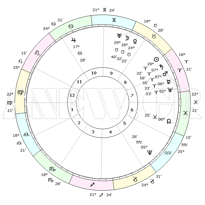 | | ΘΕΣΕΙΣ ΠΛΑΝΗΤΩΝ ΑΣΤΡΟΛΟΓΙΚΟΥ ΧΑΡΤΗ ΤΗΣ ΣΤΙΓΜΗΣ ΑΥΤΗΣ | | | | Πλανήτης | Ζώδιο | Μοίρες | Δεκαήμ. | Σε οίκο | Απόκλιση | | Ακμές των οίκων | | Ηλιος | Κριός | 29°28' | Τρίτο | 9 | 11 N 17 | | 1ος | 03°12' | Παρθένος | | Σελήνη | Ταύρος | 27°33' | Τρίτο | 9 | 24 N 30 | | 2ος | 27°24' | Παρθένος | | Ερμής | Κριός | 06°27' | Πρώτο | 8 | 00 N 09 | | 3ος | 26°21' | Ζυγός | | Αφροδίτη | Ταύρος | 24°21' | Τρίτο | 9 | 19 N 13 | | 4ος | 29°17' | Σκορπιός | | Αρης | Κριός | 07°32' | Πρώτο | 8 | 02 N 07 | | 5ος | 03°16' | Αιγόκερως | | Δίας | Καρκίνος | 17°27' | Δεύτερο | 11 | 22 N 40 | | 6ος | 04°59' | Υδροχόος | | Κρόνος | Κριός | 07°56' | Πρώτο | 8 | 01 N 10 | | 7ος | 03°12' | Ιχθείς | | Ουρανός | Ταύρος | 29°39' | Τρίτο | 10 | 19 N 55 | | 8ος | 27°24' | Ιχθείς | | Ποσειδώνας | Κριός | 02°53' | Πρώτο | 8 | 00 S 04 | | 9ος | 26°21' | Κριός | | Πλούτωνας | Υδροχόος | 05°26' | Πρώτο | 6 | 22 S 48 | | 10ος | 29°17' | Ταύρος | | Β. Δεσμός | Ιχθείς | 06°25' | Πρώτο | 7 | 09 S 09 | | 11ος | 03°16' | Καρκίνος | | Ωροσκόπος | Παρθένος | 03°12' | Πρώτο | | | 12ος | 04°59' | Λέων | | Μεσουράνημα | Ταύρος | 29°17' | Τρίτο | | | |