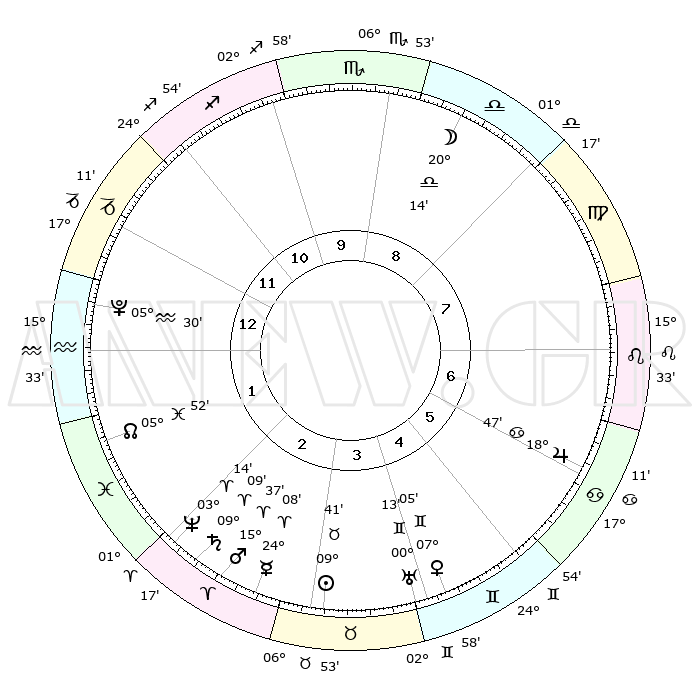 | | ΘΕΣΕΙΣ ΠΛΑΝΗΤΩΝ ΑΣΤΡΟΛΟΓΙΚΟΥ ΧΑΡΤΗ ΤΗΣ ΣΤΙΓΜΗΣ ΑΥΤΗΣ | | | | Πλανήτης | Ζώδιο | Μοίρες | Δεκαήμ. | Σε οίκο | Απόκλιση | | Ακμές των οίκων | | Ηλιος | Ταύρος | 09°35' | Πρώτο | 4 | 14 N 41 | | 1ος | 05°27' | Αιγόκερως | | Σελήνη | Ζυγός | 19°01' | Δεύτερο | 9 | 10 S 34 | | 2ος | 13°60' | Υδροχόος | | Ερμής | Κριός | 23°57' | Τρίτο | 3 | 07 N 24 | | 3ος | 24°15' | Ιχθείς | | Αφροδίτη | Δίδυμοι | 06°58' | Πρώτο | 5 | 22 N 18 | | 4ος | 27°16' | Κριός | | Αρης | Κριός | 15°32' | Δεύτερο | 3 | 05 N 17 | | 5ος | 22°45' | Ταύρος | | Δίας | Καρκίνος | 18°46' | Δεύτερο | 7 | 22 N 30 | | 6ος | 14°15' | Δίδυμοι | | Κρόνος | Κριός | 09°08' | Πρώτο | 3 | 01 N 38 | | 7ος | 05°27' | Καρκίνος | | Ουρανός | Δίδυμοι | 00°13' | Πρώτο | 5 | 20 N 02 | | 8ος | 13°60' | Λέων | | Ποσειδώνας | Κριός | 03°14' | Πρώτο | 3 | 00 N 04 | | 9ος | 24°15' | Παρθένος | | Πλούτωνας | Υδροχόος | 05°30' | Πρώτο | 1 | 22 S 49 | | 10ος | 27°16' | Ζυγός | | Β. Δεσμός | Ιχθείς | 05°52' | Πρώτο | 2 | 09 S 21 | | 11ος | 22°45' | Σκορπιός | | Ωροσκόπος | Αιγόκερως | 05°27' | Πρώτο | | | 12ος | 14°15' | Τοξότης | | Μεσουράνημα | Ζυγός | 27°16' | Τρίτο | | | |