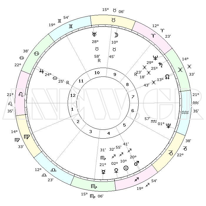 | | ΘΕΣΕΙΣ ΠΛΑΝΗΤΩΝ ΑΣΤΡΟΛΟΓΙΚΟΥ ΧΑΡΤΗ ΤΗΣ ΣΤΙΓΜΗΣ ΑΥΤΗΣ | | | | Πλανήτης | Ζώδιο | Μοίρες | Δεκαήμ. | Σε οίκο | Απόκλιση | | Ακμές των οίκων | | Ηλιος | Τοξότης | 10°53' | Δεύτερο | 5 | 22 S 04 | | 1ος | 12°32' | Λέων | | Σελήνη | Ταύρος | 10°17' | Δεύτερο | 10 | 18 N 51 | | 2ος | 04°36' | Παρθένος | | Ερμής | Σκορπιός | 21°30' | Τρίτο | 4 | 15 S 37 | | 3ος | 01°20' | Ζυγός | | Αφροδίτη | Τοξότης | 02°30' | Πρώτο | 4 | 20 S 02 | | 4ος | 03°36' | Σκορπιός | | Αρης | Τοξότης | 20°39' | Τρίτο | 5 | 23 S 47 | | 5ος | 09°02' | Τοξότης | | Δίας | Καρκίνος | 24°25'R | Τρίτο | 12 | 21 N 24 | | 6ος | 12°51' | Αιγόκερως | | Κρόνος | Ιχθείς | 25°18' | Τρίτο | 8 | 04 S 02 | | 7ος | 12°32' | Υδροχόος | | Ουρανός | Ταύρος | 28°58'R | Τρίτο | 10 | 19 N 43 | | 8ος | 04°36' | Ιχθείς | | Ποσειδώνας | Ιχθείς | 29°23'R | Τρίτο | 8 | 01 S 29 | | 9ος | 01°20' | Κριός | | Πλούτωνας | Υδροχόος | 01°57' | Πρώτο | 6 | 23 S 23 | | 10ος | 03°36' | Ταύρος | | Β. Δεσμός | Ιχθείς | 13°43' | Δεύτερο | 8 | 06 S 24 | | 11ος | 09°02' | Δίδυμοι | | Ωροσκόπος | Λέων | 12°32' | Δεύτερο | | | 12ος | 12°51' | Καρκίνος | | Μεσουράνημα | Ταύρος | 03°36' | Πρώτο | | | |