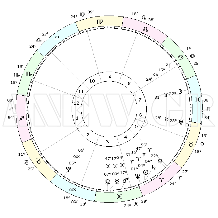 | | ΘΕΣΕΙΣ ΠΛΑΝΗΤΩΝ ΑΣΤΡΟΛΟΓΙΚΟΥ ΧΑΡΤΗ ΤΗΣ ΣΤΙΓΜΗΣ ΑΥΤΗΣ | | | | Πλανήτης | Ζώδιο | Μοίρες | Δεκαήμ. | Σε οίκο | Απόκλιση | | Ακμές των οίκων | | Ηλιος | Κριός | 04°12' | Πρώτο | 5 | 01 N 40 | | 1ος | 15°09' | Σκορπιός | | Σελήνη | Δίδυμοι | 21°22' | Τρίτο | 8 | 28 N 15 | | 2ος | 14°39' | Τοξότης | | Ερμής | Ιχθείς | 09°15' | Πρώτο | 4 | 08 S 03 | | 3ος | 18°09' | Αιγόκερως | | Αφροδίτη | Κριός | 22°49' | Τρίτο | 5 | 08 N 12 | | 4ος | 23°26' | Υδροχόος | | Αρης | Ιχθείς | 17°31' | Δεύτερο | 4 | 05 S 55 | | 5ος | 25°51' | Ιχθείς | | Δίας | Καρκίνος | 15°23' | Δεύτερο | 8 | 22 N 55 | | 6ος | 22°52' | Κριός | | Κρόνος | Κριός | 04°46' | Πρώτο | 5 | 00 S 03 | | 7ος | 15°09' | Ταύρος | | Ουρανός | Ταύρος | 28°28' | Τρίτο | 7 | 19 N 39 | | 8ος | 14°39' | Δίδυμοι | | Ποσειδώνας | Κριός | 01°56' | Πρώτο | 5 | 00 S 26 | | 9ος | 18°09' | Καρκίνος | | Πλούτωνας | Υδροχόος | 05°05' | Πρώτο | 3 | 22 S 48 | | 10ος | 23°26' | Λέων | | Β. Δεσμός | Ιχθείς | 07°47' | Πρώτο | 4 | 08 S 39 | | 11ος | 25°51' | Παρθένος | | Ωροσκόπος | Σκορπιός | 15°09' | Δεύτερο | | | 12ος | 22°52' | Ζυγός | | Μεσουράνημα | Λέων | 23°26' | Τρίτο | | | |
