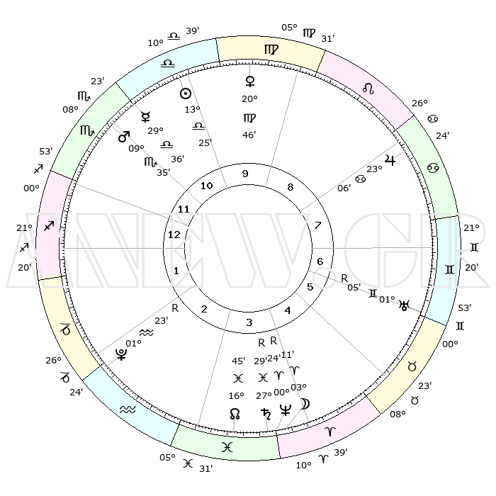 | ΘΕΣΕΙΣ ΠΛΑΝΗΤΩΝ ΑΣΤΡΟΛΟΓΙΚΟΥ ΧΑΡΤΗ ΤΗΣ ΣΤΙΓΜΗΣ ΑΥΤΗΣ | | Πλανήτης | Ζώδιο | Μοίρες | Δεκαήμ. | Σε οίκο | Απόκλιση | | Ακμές των οίκων | Ηλιος | Ζυγός | 13°20' | Δεύτερο | 11 | 05 S 16 | | 1ος | 25°45' | Σκορπιός | Σελήνη | Κριός | 01°56' | Πρώτο | 4 | 01 N 54 | | 2ος | 26°19' | Τοξότης | Ερμής | Ζυγός | 29°28' | Τρίτο | 11 | 11 S 58 | | 3ος | 01°20' | Υδροχόος | Αφροδίτη | Παρθένος | 20°40' | Τρίτο | 10 | 04 N 59 | | 4ος | 07°15' | Ιχθείς | Αρης | Σκορπιός | 09°31' | Πρώτο | 12 | 14 S 47 | | 5ος | 08°46' | Κριός | Δίας | Καρκίνος | 23°05' | Τρίτο | 8 | 21 N 29 | | 6ος | 04°24' | Ταύρος | Κρόνος | Ιχθείς | 27°29'R | Τρίτο | 4 | 03 S 18 | | 7ος | 25°45' | Ταύρος | Ουρανός | Δίδυμοι | 01°05'R | Πρώτο | 7 | 20 N 10 | | 8ος | 26°19' | Δίδυμοι | Ποσειδώνας | Κριός | 00°24'R | Πρώτο | 4 | 01 S 06 | | 9ος | 01°20' | Λέων | Πλούτωνας | Υδροχόος | 01°23'R | Πρώτο | 3 | 23 S 32 | | 10ος | 07°15' | Παρθένος | Β. Δεσμός | Ιχθείς | 16°46' | Δεύτερο | 4 | 05 S 14 | | 11ος | 08°46' | Ζυγός | Ωροσκόπος | Σκορπιός | 25°45' | Τρίτο | | | 12ος | 04°24' | Σκορπιός | Μεσουράνημα | Παρθένος | 07°15' | Πρώτο | | | |