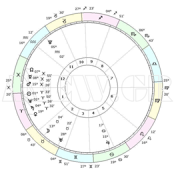 | | ΘΕΣΕΙΣ ΠΛΑΝΗΤΩΝ ΑΣΤΡΟΛΟΓΙΚΟΥ ΧΑΡΤΗ ΤΗΣ ΣΤΙΓΜΗΣ ΑΥΤΗΣ | | | | Πλανήτης | Ζώδιο | Μοίρες | Δεκαήμ. | Σε οίκο | Απόκλιση | | Ακμές των οίκων | | Ηλιος | Κριός | 01°25' | Πρώτο | 2 | 00 N 34 | | 1ος | 13°15' | Αιγόκερως | | Σελήνη | Ταύρος | 10°54' | Δεύτερο | 4 | 19 N 29 | | 2ος | 23°47' | Υδροχόος | | Ερμής | Ιχθείς | 08°34' | Πρώτο | 2 | 07 S 43 | | 3ος | 03°59' | Κριός | | Αφροδίτη | Κριός | 19°21' | Δεύτερο | 3 | 06 N 48 | | 4ος | 05°33' | Ταύρος | | Αρης | Ιχθείς | 15°19' | Δεύτερο | 2 | 06 S 47 | | 5ος | 29°58' | Ταύρος | | Δίας | Καρκίνος | 15°17' | Δεύτερο | 7 | 22 N 55 | | 6ος | 21°13' | Δίδυμοι | | Κρόνος | Κριός | 04°25' | Πρώτο | 3 | 00 S 12 | | 7ος | 13°15' | Καρκίνος | | Ουρανός | Ταύρος | 28°22' | Τρίτο | 4 | 19 N 37 | | 8ος | 23°47' | Λέων | | Ποσειδώνας | Κριός | 01°50' | Πρώτο | 2 | 00 S 28 | | 9ος | 03°59' | Ζυγός | | Πλούτωνας | Υδροχόος | 05°02' | Πρώτο | 1 | 22 S 48 | | 10ος | 05°33' | Σκορπιός | | Β. Δεσμός | Ιχθείς | 07°56' | Πρώτο | 2 | 08 S 36 | | 11ος | 29°58' | Σκορπιός | | Ωροσκόπος | Αιγόκερως | 13°15' | Δεύτερο | | | 12ος | 21°13' | Τοξότης | | Μεσουράνημα | Σκορπιός | 05°33' | Πρώτο | | | |