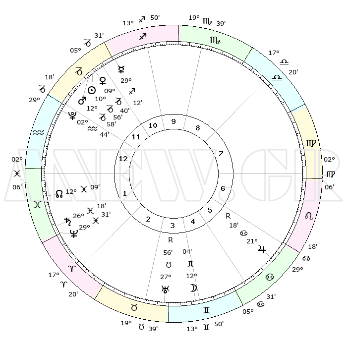 | | ΘΕΣΕΙΣ ΠΛΑΝΗΤΩΝ ΑΣΤΡΟΛΟΓΙΚΟΥ ΧΑΡΤΗ ΤΗΣ ΣΤΙΓΜΗΣ ΑΥΤΗΣ | | | | Πλανήτης | Ζώδιο | Μοίρες | Δεκαήμ. | Σε οίκο | Απόκλιση | | Ακμές των οίκων | | Ηλιος | Αιγόκερως | 10°51' | Δεύτερο | 12 | 22 S 59 | | 1ος | 26°01' | Αιγόκερως | | Σελήνη | Δίδυμοι | 10°55' | Δεύτερο | 5 | 27 N 05 | | 2ος | 09°25' | Ιχθείς | | Ερμής | Τοξότης | 29°05' | Τρίτο | 11 | 24 S 02 | | 3ος | 18°27' | Κριός | | Αφροδίτη | Αιγόκερως | 09°34' | Πρώτο | 12 | 23 S 36 | | 4ος | 17°37' | Ταύρος | | Αρης | Αιγόκερως | 12°55' | Δεύτερο | 12 | 23 S 42 | | 5ος | 10°41' | Δίδυμοι | | Δίας | Καρκίνος | 21°19'R | Τρίτο | 6 | 21 N 59 | | 6ος | 01°59' | Καρκίνος | | Κρόνος | Ιχθείς | 26°18' | Τρίτο | 2 | 03 S 33 | | 7ος | 26°02' | Καρκίνος | | Ουρανός | Ταύρος | 27°56'R | Τρίτο | 4 | 19 N 30 | | 8ος | 09°25' | Παρθένος | | Ποσειδώνας | Ιχθείς | 29°31' | Τρίτο | 2 | 01 S 25 | | 9ος | 18°27' | Ζυγός | | Πλούτωνας | Υδροχόος | 02°44' | Πρώτο | 1 | 23 S 13 | | 10ος | 17°37' | Σκορπιός | | Β. Δεσμός | Ιχθείς | 12°09' | Δεύτερο | 2 | 07 S 00 | | 11ος | 10°41' | Τοξότης | | Ωροσκόπος | Αιγόκερως | 26°01' | Τρίτο | | | 12ος | 01°59' | Αιγόκερως | | Μεσουράνημα | Σκορπιός | 17°37' | Δεύτερο | | | |
