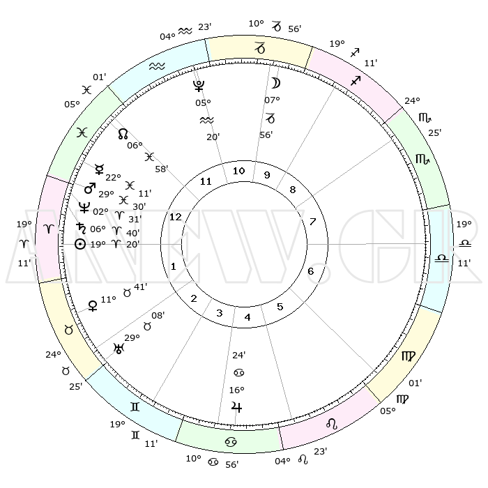 | | ΘΕΣΕΙΣ ΠΛΑΝΗΤΩΝ ΑΣΤΡΟΛΟΓΙΚΟΥ ΧΑΡΤΗ ΤΗΣ ΣΤΙΓΜΗΣ ΑΥΤΗΣ | | | | Πλανήτης | Ζώδιο | Μοίρες | Δεκαήμ. | Σε οίκο | Απόκλιση | | Ακμές των οίκων | | Ηλιος | Κριός | 19°16' | Δεύτερο | 1 | 07 N 32 | | 1ος | 09°33' | Ιχθείς | | Σελήνη | Αιγόκερως | 07°07' | Πρώτο | 10 | 27 S 45 | | 2ος | 23°54' | Κριός | | Ερμής | Ιχθείς | 22°06' | Τρίτο | 1 | 05 S 13 | | 3ος | 24°47' | Ταύρος | | Αφροδίτη | Ταύρος | 11°36' | Δεύτερο | 2 | 15 N 13 | | 4ος | 18°20' | Δίδυμοι | | Αρης | Ιχθείς | 29°27' | Τρίτο | 1 | 01 S 09 | | 5ος | 10°03' | Καρκίνος | | Δίας | Καρκίνος | 16°24' | Δεύτερο | 5 | 22 N 48 | | 6ος | 04°40' | Λέων | | Κρόνος | Κριός | 06°40' | Πρώτο | 1 | 00 N 41 | | 7ος | 09°33' | Παρθένος | | Ουρανός | Ταύρος | 29°08' | Τρίτο | 3 | 19 N 48 | | 8ος | 23°54' | Ζυγός | | Ποσειδώνας | Κριός | 02°31' | Πρώτο | 1 | 00 S 12 | | 9ος | 24°47' | Σκορπιός | | Πλούτωνας | Υδροχόος | 05°20' | Πρώτο | 12 | 22 S 47 | | 10ος | 18°20' | Τοξότης | | Β. Δεσμός | Ιχθείς | 06°58' | Πρώτο | 12 | 08 S 57 | | 11ος | 10°03' | Αιγόκερως | | Ωροσκόπος | Ιχθείς | 09°33' | Πρώτο | | | 12ος | 04°41' | Υδροχόος | | Μεσουράνημα | Τοξότης | 18°20' | Δεύτερο | | | |
