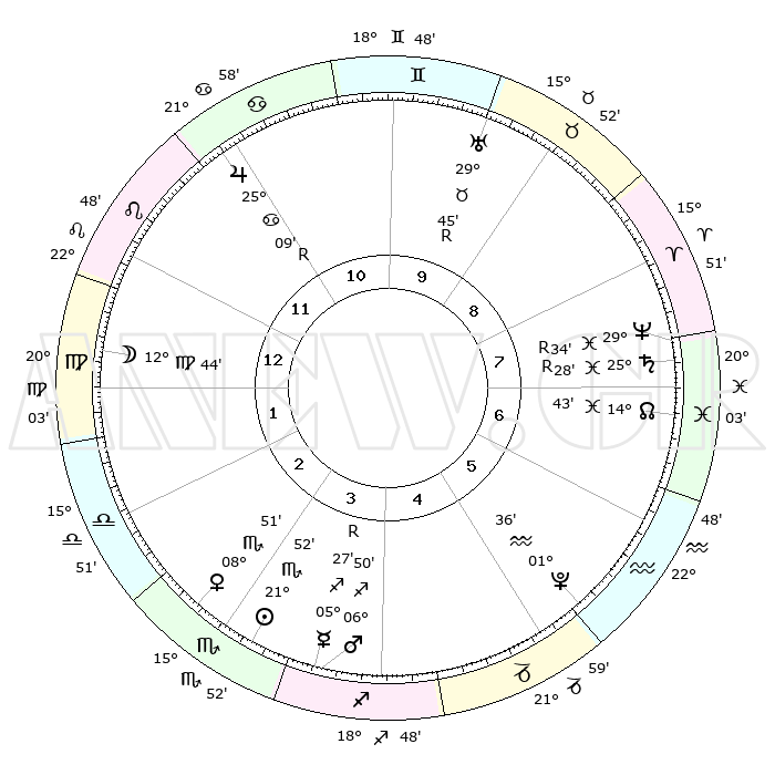 | | ΘΕΣΕΙΣ ΠΛΑΝΗΤΩΝ ΑΣΤΡΟΛΟΓΙΚΟΥ ΧΑΡΤΗ ΤΗΣ ΣΤΙΓΜΗΣ ΑΥΤΗΣ | | | | Πλανήτης | Ζώδιο | Μοίρες | Δεκαήμ. | Σε οίκο | Απόκλιση | | Ακμές των οίκων | | Ηλιος | Σκορπιός | 21°48' | Τρίτο | 3 | 18 S 13 | | 1ος | 00°19' | Παρθένος | | Σελήνη | Παρθένος | 11°54' | Δεύτερο | 1 | 07 N 27 | | 2ος | 24°12' | Παρθένος | | Ερμής | Τοξότης | 05°30'R | Πρώτο | 4 | 22 S 42 | | 3ος | 22°54' | Ζυγός | | Αφροδίτη | Σκορπιός | 08°46' | Πρώτο | 3 | 13 S 15 | | 4ος | 25°49' | Σκορπιός | | Αρης | Τοξότης | 06°47' | Πρώτο | 4 | 21 S 57 | | 5ος | 29°60' | Τοξότης | | Δίας | Καρκίνος | 25°09'R | Τρίτο | 11 | 21 N 13 | | 6ος | 01°55' | Υδροχόος | | Κρόνος | Ιχθείς | 25°28'R | Τρίτο | 8 | 04 S 02 | | 7ος | 00°19' | Ιχθείς | | Ουρανός | Ταύρος | 29°45'R | Τρίτο | 10 | 19 N 53 | | 8ος | 24°12' | Ιχθείς | | Ποσειδώνας | Ιχθείς | 29°34'R | Τρίτο | 8 | 01 S 25 | | 9ος | 22°54' | Κριός | | Πλούτωνας | Υδροχόος | 01°36' | Πρώτο | 5 | 23 S 28 | | 10ος | 25°49' | Ταύρος | | Β. Δεσμός | Ιχθείς | 14°43' | Δεύτερο | 7 | 06 S 01 | | 11ος | 29°60' | Δίδυμοι | | Ωροσκόπος | Παρθένος | 00°19' | Πρώτο | | | 12ος | 01°55' | Λέων | | Μεσουράνημα | Ταύρος | 25°49' | Τρίτο | | | |