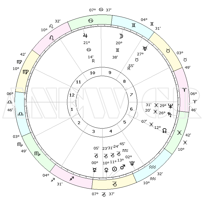 | | ΘΕΣΕΙΣ ΠΛΑΝΗΤΩΝ ΑΣΤΡΟΛΟΓΙΚΟΥ ΧΑΡΤΗ ΤΗΣ ΣΤΙΓΜΗΣ ΑΥΤΗΣ | | | | Πλανήτης | Ζώδιο | Μοίρες | Δεκαήμ. | Σε οίκο | Απόκλιση | | Ακμές των οίκων | | Ηλιος | Αιγόκερως | 11°26' | Δεύτερο | 4 | 22 S 56 | | 1ος | 14°15' | Παρθένος | | Σελήνη | Δίδυμοι | 19°29' | Δεύτερο | 10 | 28 N 00 | | 2ος | 09°32' | Ζυγός | | Ερμής | Τοξότης | 29°58' | Τρίτο | 4 | 24 S 06 | | 3ος | 09°15' | Σκορπιός | | Αφροδίτη | Αιγόκερως | 10°17' | Δεύτερο | 4 | 23 S 34 | | 4ος | 12°12' | Τοξότης | | Αρης | Αιγόκερως | 13°21' | Δεύτερο | 4 | 23 S 39 | | 5ος | 15°35' | Αιγόκερως | | Δίας | Καρκίνος | 21°14'R | Τρίτο | 11 | 22 N 00 | | 6ος | 16°40' | Υδροχόος | | Κρόνος | Ιχθείς | 26°20' | Τρίτο | 7 | 03 S 32 | | 7ος | 14°15' | Ιχθείς | | Ουρανός | Ταύρος | 27°55'R | Τρίτο | 9 | 19 N 30 | | 8ος | 09°32' | Κριός | | Ποσειδώνας | Ιχθείς | 29°31' | Τρίτο | 7 | 01 S 25 | | 9ος | 09°15' | Ταύρος | | Πλούτωνας | Υδροχόος | 02°45' | Πρώτο | 5 | 23 S 13 | | 10ος | 12°12' | Δίδυμοι | | Β. Δεσμός | Ιχθείς | 12°07' | Δεύτερο | 6 | 07 S 01 | | 11ος | 15°35' | Καρκίνος | | Ωροσκόπος | Παρθένος | 14°15' | Δεύτερο | | | 12ος | 16°40' | Λέων | | Μεσουράνημα | Δίδυμοι | 12°12' | Δεύτερο | | | |