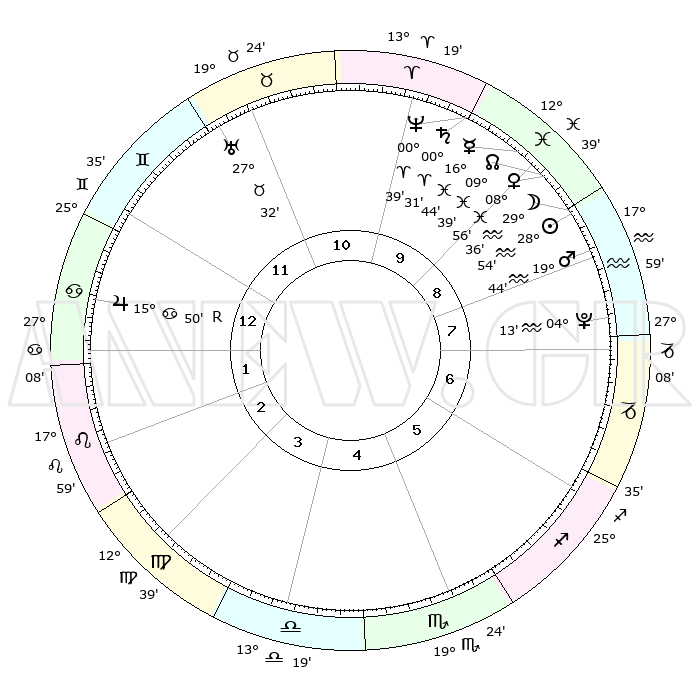 | | ΘΕΣΕΙΣ ΠΛΑΝΗΤΩΝ ΑΣΤΡΟΛΟΓΙΚΟΥ ΧΑΡΤΗ ΤΗΣ ΣΤΙΓΜΗΣ ΑΥΤΗΣ | | | | Πλανήτης | Ζώδιο | Μοίρες | Δεκαήμ. | Σε οίκο | Απόκλιση | | Ακμές των οίκων | | Ηλιος | Υδροχόος | 28°49' | Τρίτο | 9 | 11 S 53 | | 1ος | 03°60' | Καρκίνος | | Σελήνη | Υδροχόος | 28°36' | Τρίτο | 9 | 12 S 51 | | 2ος | 24°35' | Καρκίνος | | Ερμής | Ιχθείς | 16°39' | Δεύτερο | 10 | 04 S 42 | | 3ος | 16°40' | Λέων | | Αφροδίτη | Ιχθείς | 08°50' | Πρώτο | 9 | 09 S 37 | | 4ος | 13°38' | Παρθένος | | Αρης | Υδροχόος | 19°41' | Δεύτερο | 9 | 15 S 56 | | 5ος | 18°11' | Ζυγός | | Δίας | Καρκίνος | 15°51'R | Δεύτερο | 1 | 22 N 49 | | 6ος | 27°50' | Σκορπιός | | Κρόνος | Κριός | 00°30' | Πρώτο | 10 | 01 S 46 | | 7ος | 03°60' | Αιγόκερως | | Ουρανός | Ταύρος | 27°32' | Τρίτο | 11 | 19 N 26 | | 8ος | 24°35' | Αιγόκερως | | Ποσειδώνας | Κριός | 00°39' | Πρώτο | 10 | 00 S 57 | | 9ος | 16°40' | Υδροχόος | | Πλούτωνας | Υδροχόος | 04°13' | Πρώτο | 8 | 22 S 56 | | 10ος | 13°38' | Ιχθείς | | Β. Δεσμός | Ιχθείς | 09°39' | Πρώτο | 9 | 07 S 57 | | 11ος | 18°11' | Κριός | | Ωροσκόπος | Καρκίνος | 03°60' | Πρώτο | | | 12ος | 27°50' | Ταύρος | | Μεσουράνημα | Ιχθείς | 13°38' | Δεύτερο | | | |