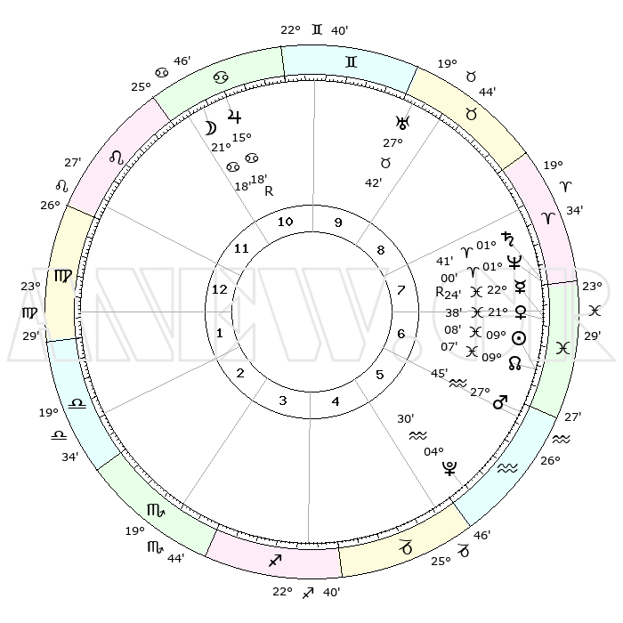 | | ΘΕΣΕΙΣ ΠΛΑΝΗΤΩΝ ΑΣΤΡΟΛΟΓΙΚΟΥ ΧΑΡΤΗ ΤΗΣ ΣΤΙΓΜΗΣ ΑΥΤΗΣ | | | | Πλανήτης | Ζώδιο | Μοίρες | Δεκαήμ. | Σε οίκο | Απόκλιση | | Ακμές των οίκων | | Ηλιος | Ιχθείς | 09°20' | Πρώτο | 4 | 08 S 04 | | 1ος | 21°56' | Σκορπιός | | Σελήνη | Καρκίνος | 24°07' | Τρίτο | 8 | 24 N 57 | | 2ος | 22°05' | Τοξότης | | Ερμής | Ιχθείς | 22°21'R | Τρίτο | 4 | 00 S 10 | | 3ος | 26°31' | Αιγόκερως | | Αφροδίτη | Ιχθείς | 21°53' | Τρίτο | 4 | 04 S 29 | | 4ος | 02°14' | Ιχθείς | | Αρης | Υδροχόος | 27°54' | Τρίτο | 3 | 13 S 13 | | 5ος | 04°08' | Κριός | | Δίας | Καρκίνος | 15°17'R | Δεύτερο | 8 | 22 N 54 | | 6ος | 00°16' | Ταύρος | | Κρόνος | Κριός | 01°43' | Πρώτο | 4 | 01 S 17 | | 7ος | 21°56' | Ταύρος | | Ουρανός | Ταύρος | 27°43' | Τρίτο | 7 | 19 N 28 | | 8ος | 22°05' | Δίδυμοι | | Ποσειδώνας | Κριός | 01°01' | Πρώτο | 4 | 00 S 48 | | 9ος | 26°31' | Καρκίνος | | Πλούτωνας | Υδροχόος | 04°30' | Πρώτο | 3 | 22 S 53 | | 10ος | 02°14' | Παρθένος | | Β. Δεσμός | Ιχθείς | 09°06' | Πρώτο | 4 | 08 S 09 | | 11ος | 04°08' | Ζυγός | | Ωροσκόπος | Σκορπιός | 21°56' | Τρίτο | | | 12ος | 00°17' | Σκορπιός | | Μεσουράνημα | Παρθένος | 02°14' | Πρώτο | | | |