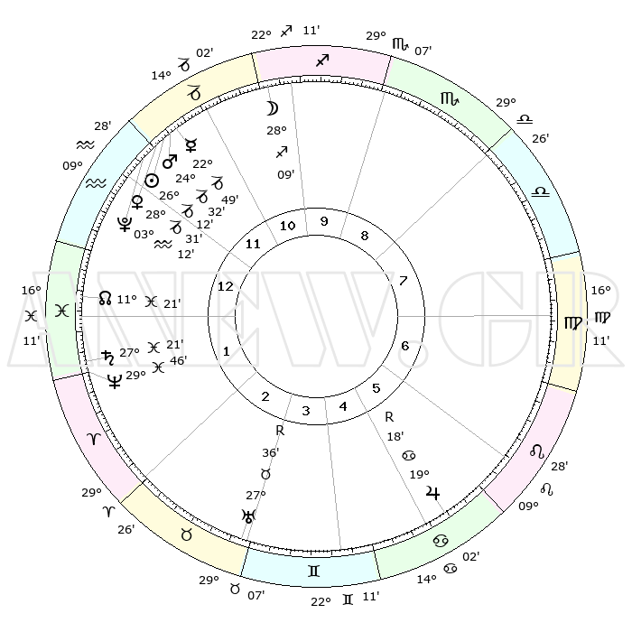 | | ΘΕΣΕΙΣ ΠΛΑΝΗΤΩΝ ΑΣΤΡΟΛΟΓΙΚΟΥ ΧΑΡΤΗ ΤΗΣ ΣΤΙΓΜΗΣ ΑΥΤΗΣ | | | | Πλανήτης | Ζώδιο | Μοίρες | Δεκαήμ. | Σε οίκο | Απόκλιση | | Ακμές των οίκων | | Ηλιος | Αιγόκερως | 26°08' | Τρίτο | 12 | 20 S 55 | | 1ος | 11°36' | Υδροχόος | | Σελήνη | Τοξότης | 27°22' | Τρίτο | 11 | 28 S 18 | | 2ος | 27°06' | Ιχθείς | | Ερμής | Αιγόκερως | 22°43' | Τρίτο | 12 | 23 S 21 | | 3ος | 03°29' | Ταύρος | | Αφροδίτη | Αιγόκερως | 28°26' | Τρίτο | 12 | 21 S 28 | | 4ος | 00°06' | Δίδυμοι | | Αρης | Αιγόκερως | 24°29' | Τρίτο | 12 | 22 S 11 | | 5ος | 22°12' | Δίδυμοι | | Δίας | Καρκίνος | 19°18'R | Δεύτερο | 6 | 22 N 19 | | 6ος | 14°12' | Καρκίνος | | Κρόνος | Ιχθείς | 27°21' | Τρίτο | 2 | 03 S 05 | | 7ος | 11°36' | Λέων | | Ουρανός | Ταύρος | 27°37'R | Τρίτο | 3 | 19 N 26 | | 8ος | 27°06' | Παρθένος | | Ποσειδώνας | Ιχθείς | 29°46' | Τρίτο | 2 | 01 S 19 | | 9ος | 03°29' | Σκορπιός | | Πλούτωνας | Υδροχόος | 03°12' | Πρώτο | 12 | 23 S 07 | | 10ος | 00°06' | Τοξότης | | Β. Δεσμός | Ιχθείς | 11°22' | Δεύτερο | 1 | 07 S 18 | | 11ος | 22°12' | Τοξότης | | Ωροσκόπος | Υδροχόος | 11°36' | Δεύτερο | | | 12ος | 14°12' | Αιγόκερως | | Μεσουράνημα | Τοξότης | 00°06' | Πρώτο | | | |