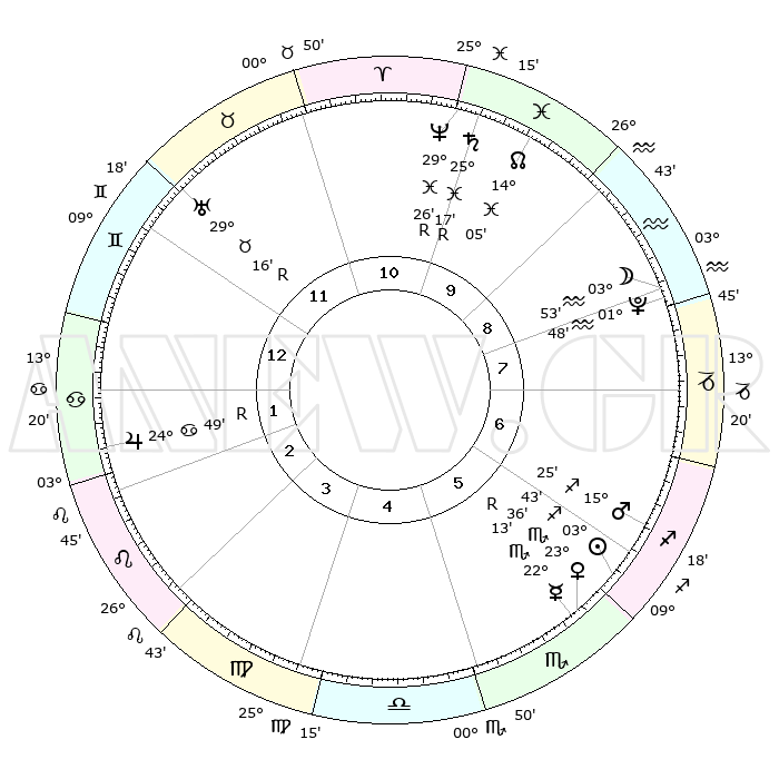 | | ΘΕΣΕΙΣ ΠΛΑΝΗΤΩΝ ΑΣΤΡΟΛΟΓΙΚΟΥ ΧΑΡΤΗ ΤΗΣ ΣΤΙΓΜΗΣ ΑΥΤΗΣ | | | | Πλανήτης | Ζώδιο | Μοίρες | Δεκαήμ. | Σε οίκο | Απόκλιση | | Ακμές των οίκων | | Ηλιος | Τοξότης | 03°38' | Πρώτο | 6 | 20 S 52 | | 1ος | 13°58' | Δίδυμοι | | Σελήνη | Υδροχόος | 02°48' | Πρώτο | 9 | 22 S 47 | | 2ος | 06°22' | Καρκίνος | | Ερμής | Σκορπιός | 22°17'R | Τρίτο | 6 | 16 S 23 | | 3ος | 27°35' | Καρκίνος | | Αφροδίτη | Σκορπιός | 23°29' | Τρίτο | 6 | 17 S 47 | | 4ος | 21°40' | Λέων | | Αρης | Τοξότης | 15°21' | Δεύτερο | 7 | 23 S 15 | | 5ος | 22°43' | Παρθένος | | Δίας | Καρκίνος | 24°50'R | Τρίτο | 2 | 21 N 18 | | 6ος | 02°46' | Σκορπιός | | Κρόνος | Ιχθείς | 25°17'R | Τρίτο | 11 | 04 S 04 | | 7ος | 13°58' | Τοξότης | | Ουρανός | Ταύρος | 29°16'R | Τρίτο | 12 | 19 N 47 | | 8ος | 06°22' | Αιγόκερως | | Ποσειδώνας | Ιχθείς | 29°26'R | Τρίτο | 11 | 01 S 28 | | 9ος | 27°35' | Αιγόκερως | | Πλούτωνας | Υδροχόος | 01°48' | Πρώτο | 9 | 23 S 26 | | 10ος | 21°40' | Υδροχόος | | Β. Δεσμός | Ιχθείς | 14°06' | Δεύτερο | 10 | 06 S 15 | | 11ος | 22°43' | Ιχθείς | | Ωροσκόπος | Δίδυμοι | 13°58' | Δεύτερο | | | 12ος | 02°46' | Ταύρος | | Μεσουράνημα | Υδροχόος | 21°40' | Τρίτο | | | |